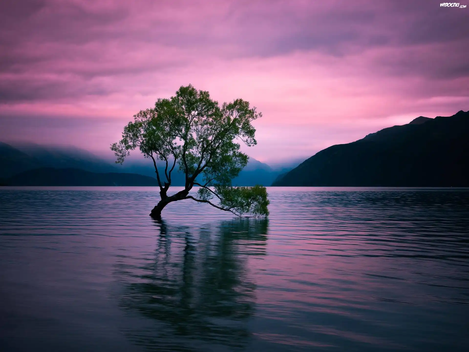 Drzewo, Jezioro, Góry, Niebo, Odbicie
