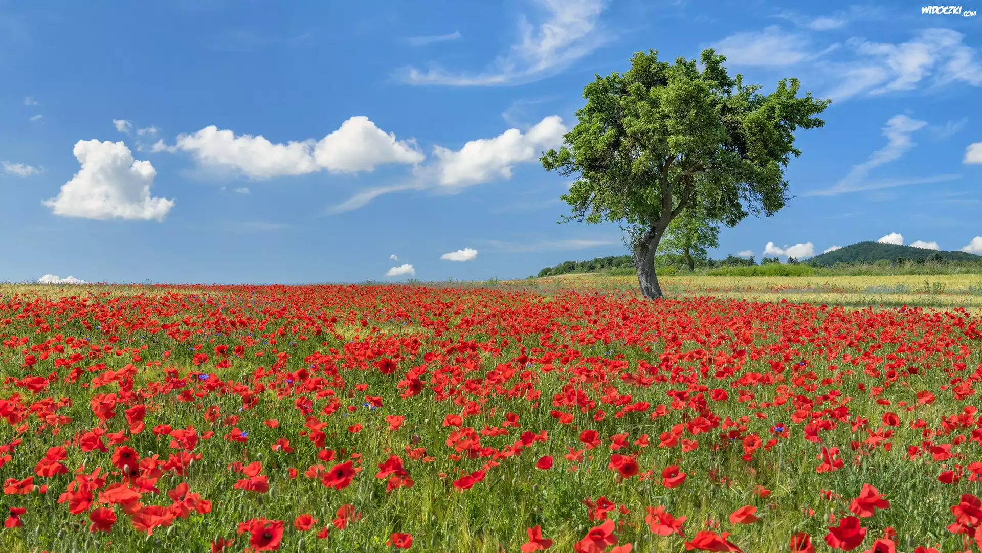 Zdjęcia, Pole, Czerwone, Maki, Drzewo, Niebo, Obloki