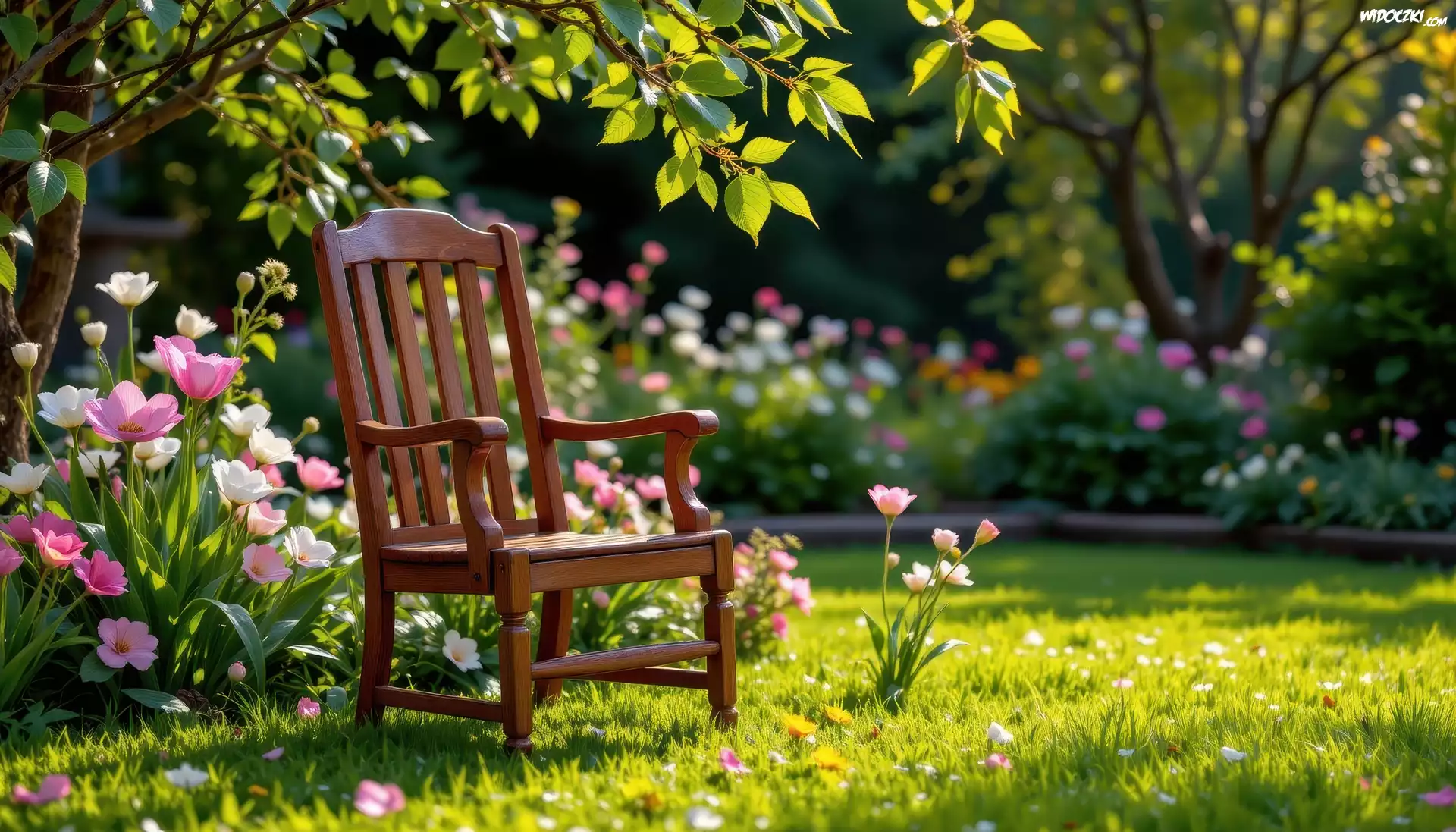 Ogród, Krzesło, Kwiaty, Drzewo