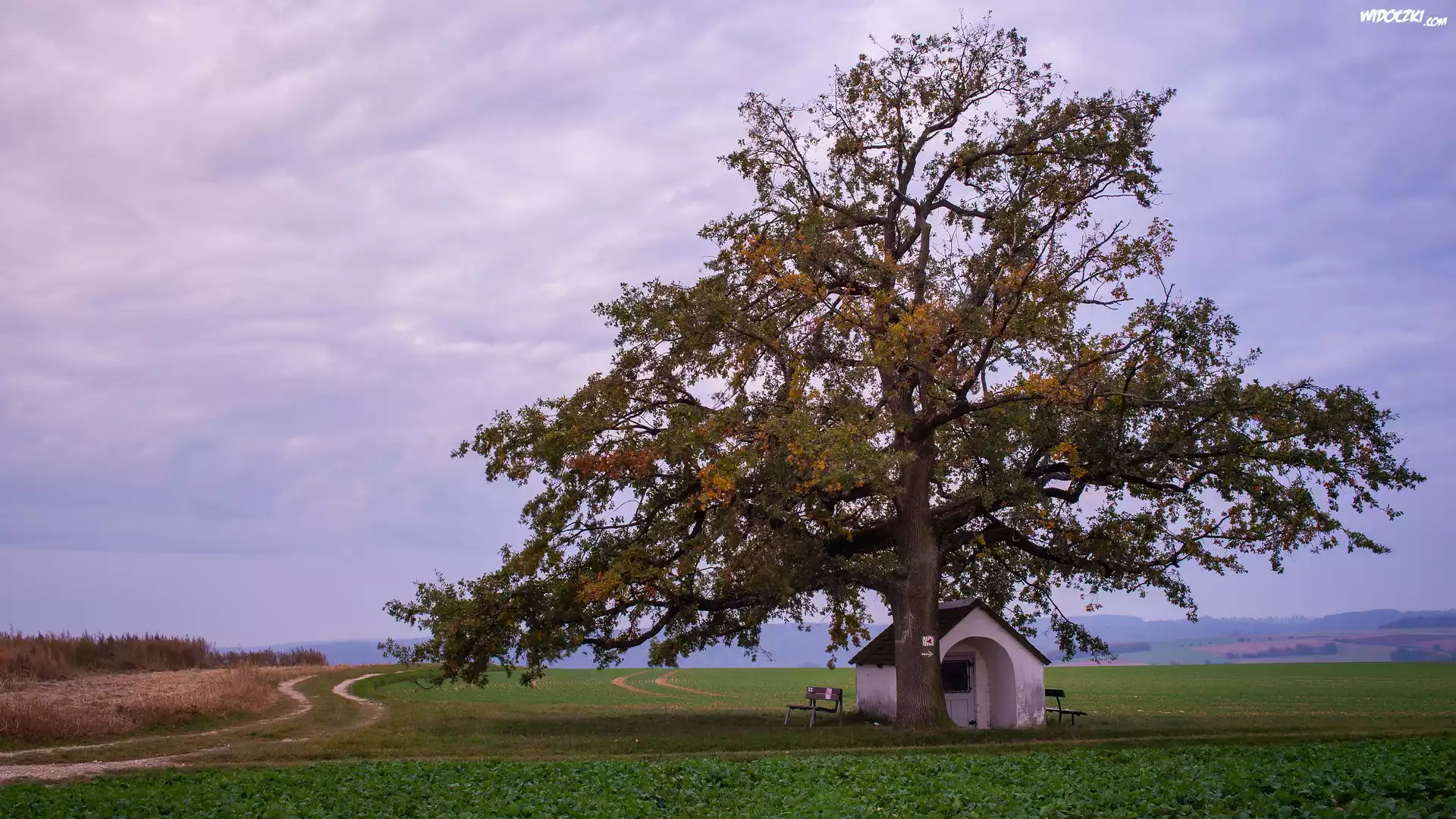 Drzewo, Kapliczka, Ławki, Pola, Droga