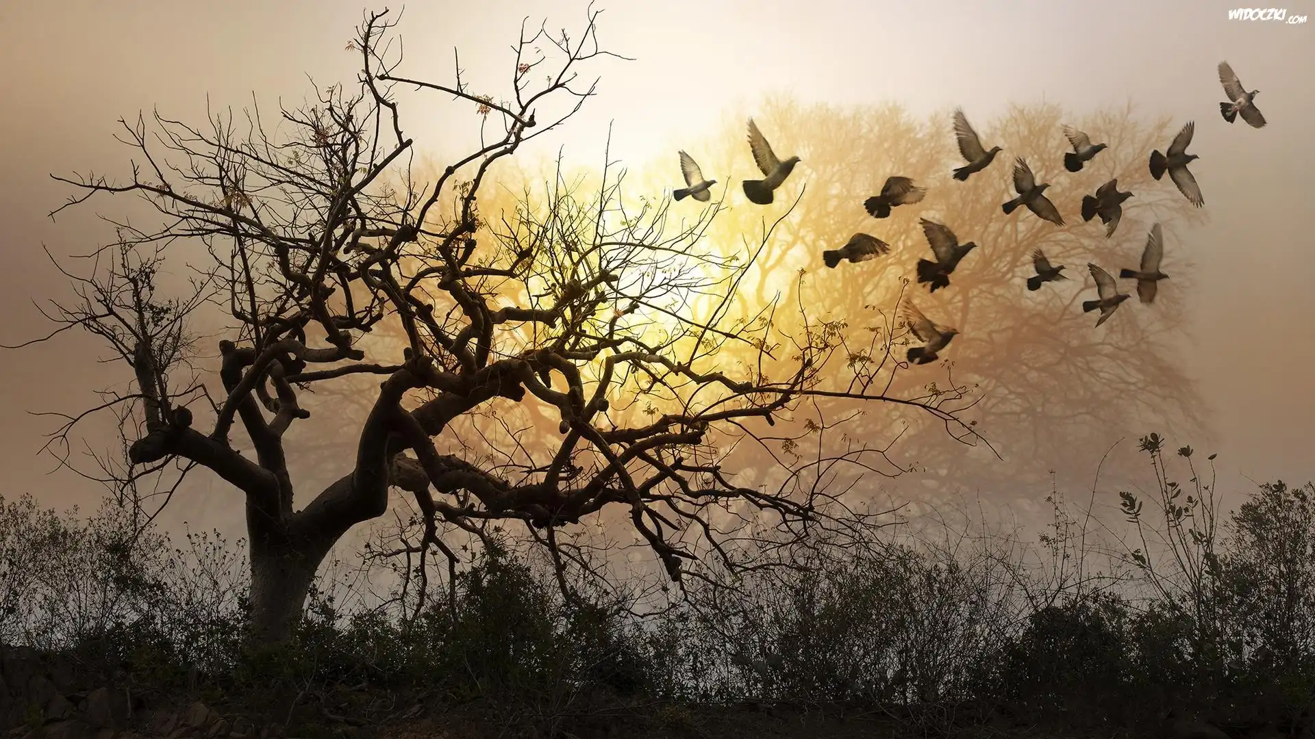Zdjęcia, Drzewo, Ptaki, Przebijające, Światło