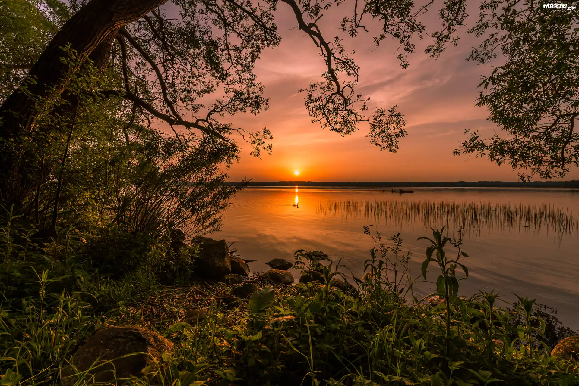 Jezioro, Drzewo, Krzewy, Kamienie, Łódki, Kaczka, Zachód słońca