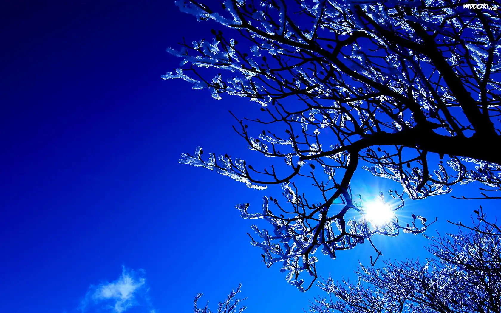 Drzewo, Oszronione, Promienie, Słońca, Niebo