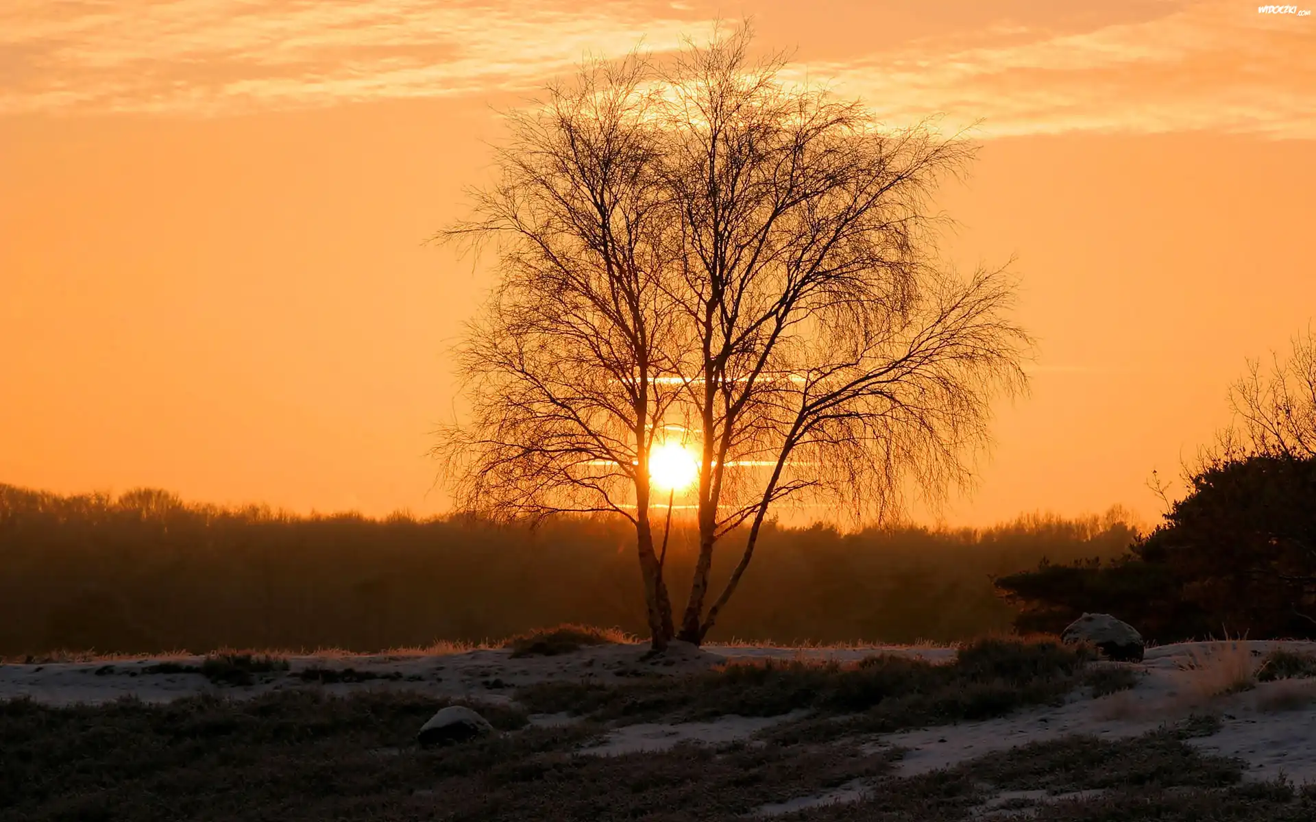 Zdjęcia, Drzewo, Zachód, Słońca, Śnieg