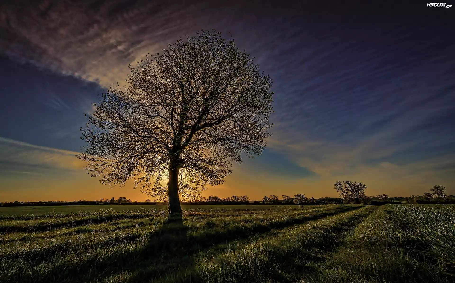Drzewo, Zachód Słońca, Pole