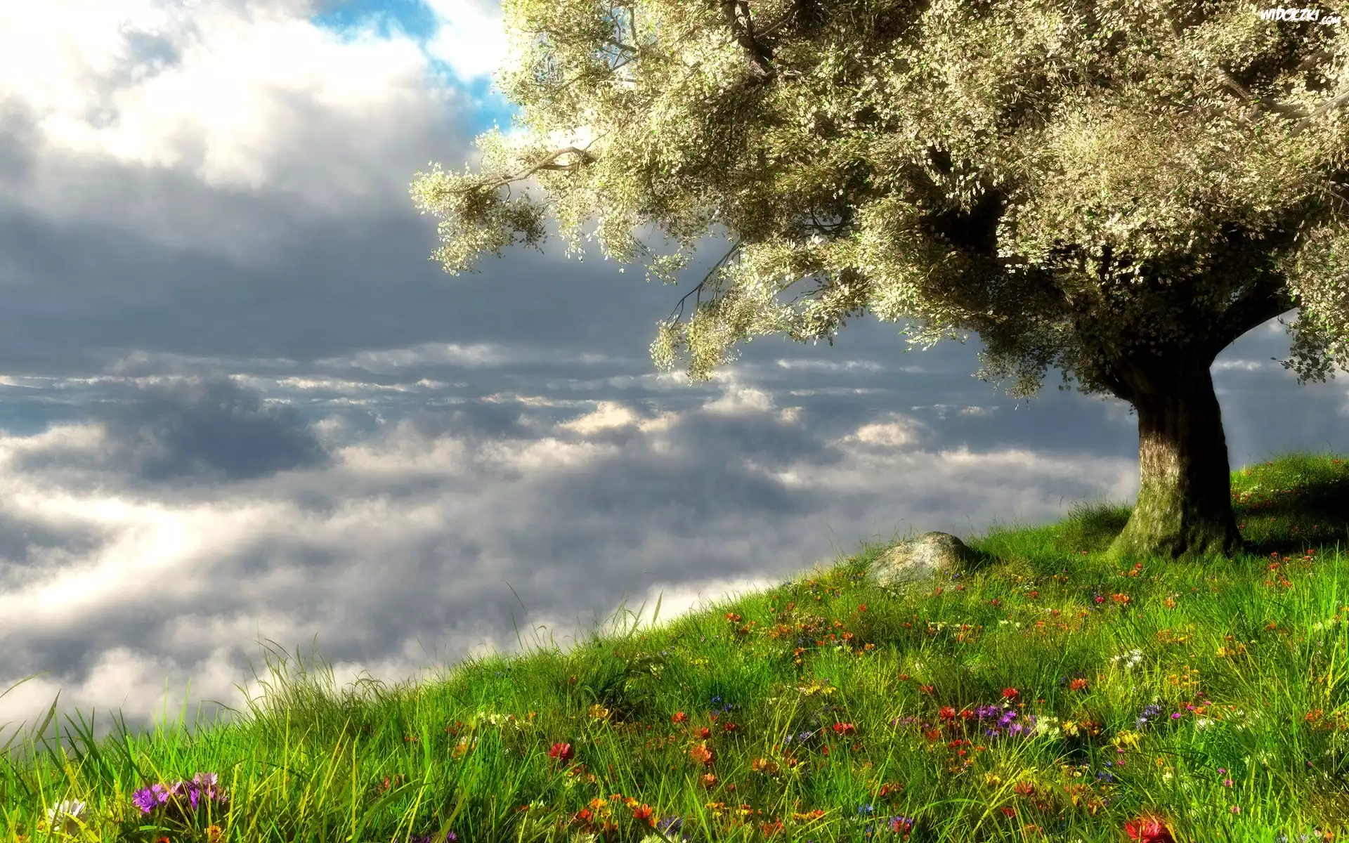 Zdj臋cia, Drzewo, Kwiaty, Trawa, Chmury
