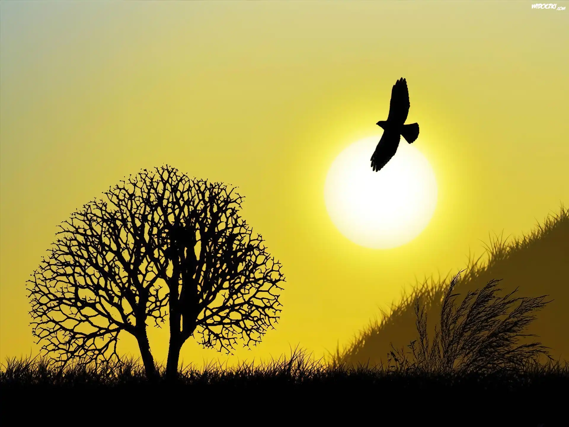 Wieczór, Drzewo, Ptak