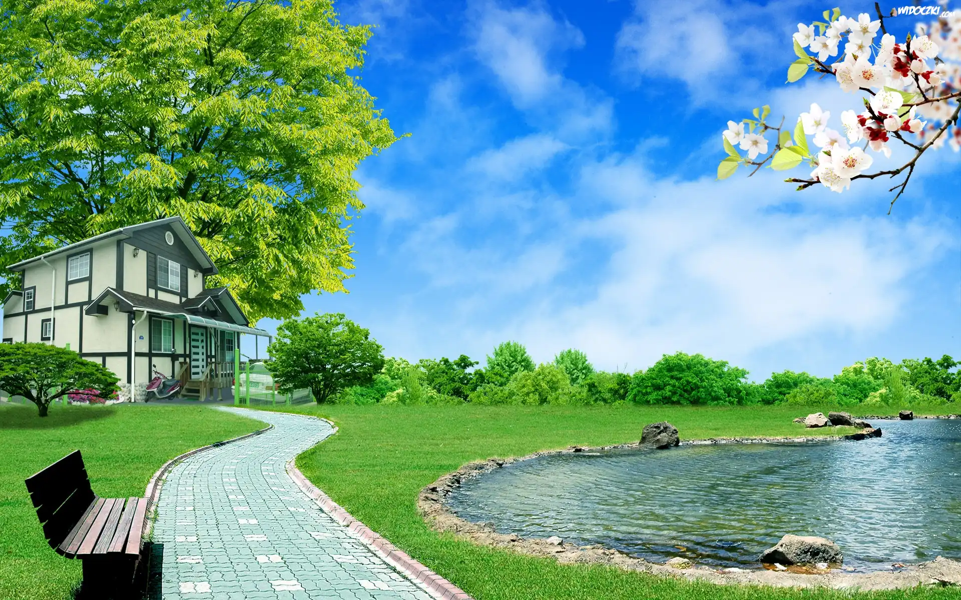 Zdjęcia, Drzewo, Ławka, Oczko, Wodne, Domek