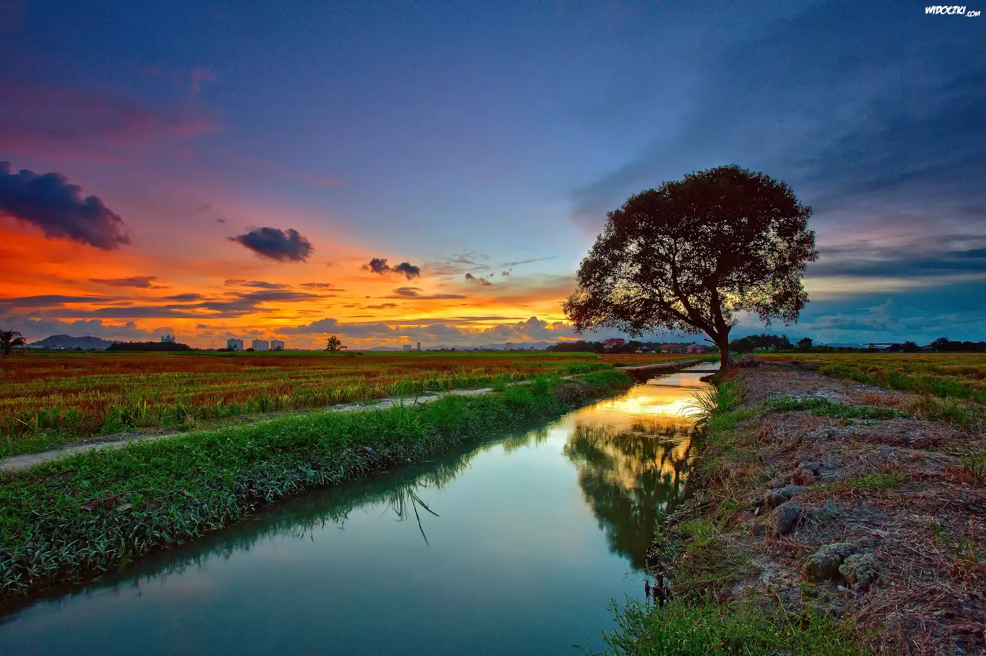 Zdjęcia, Drzewo, Rzeka, Odbicie, Pole, Zachód, Słońca