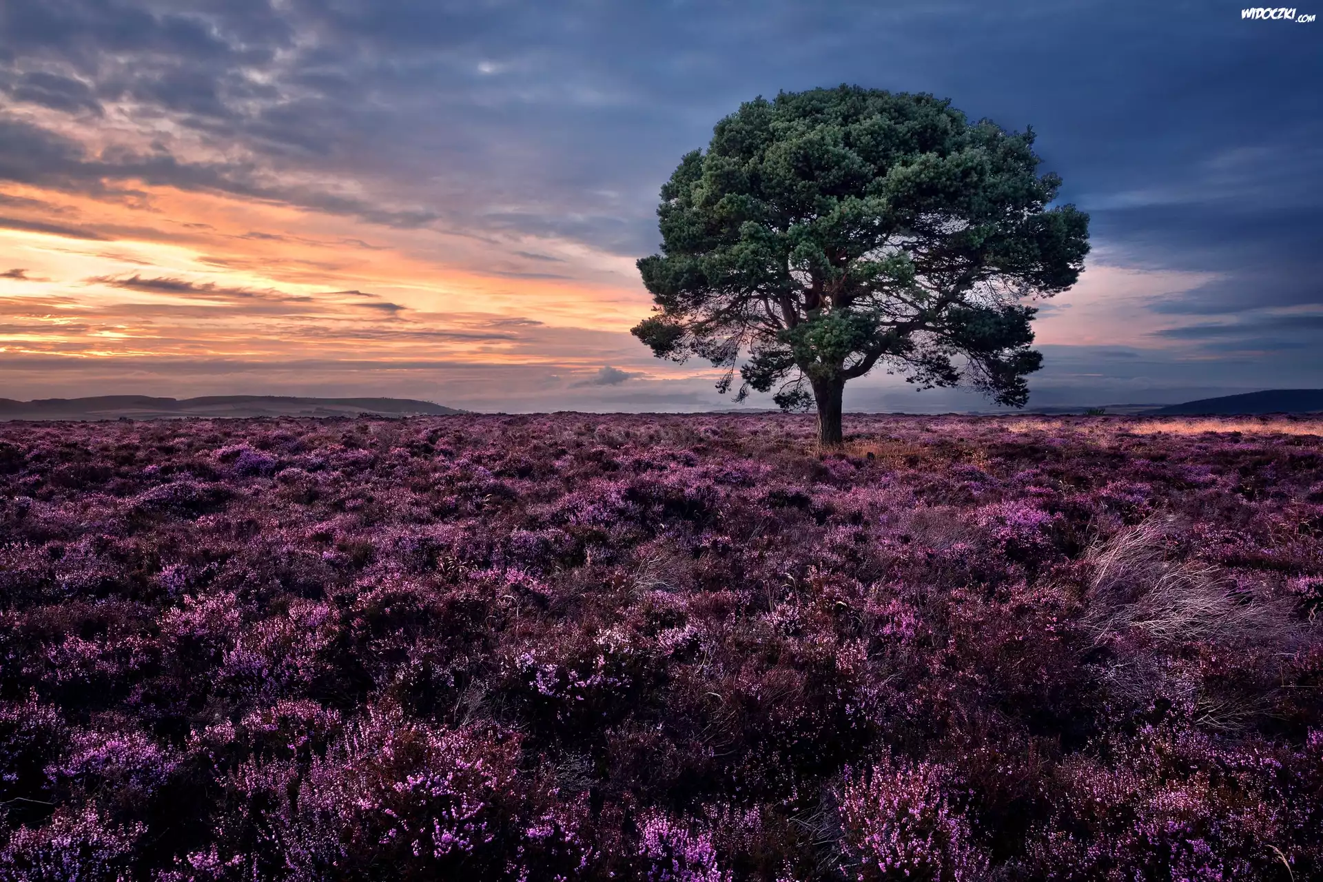 Zdjęcia, Drzewo, Wrzosowisko, Zachód Słońca