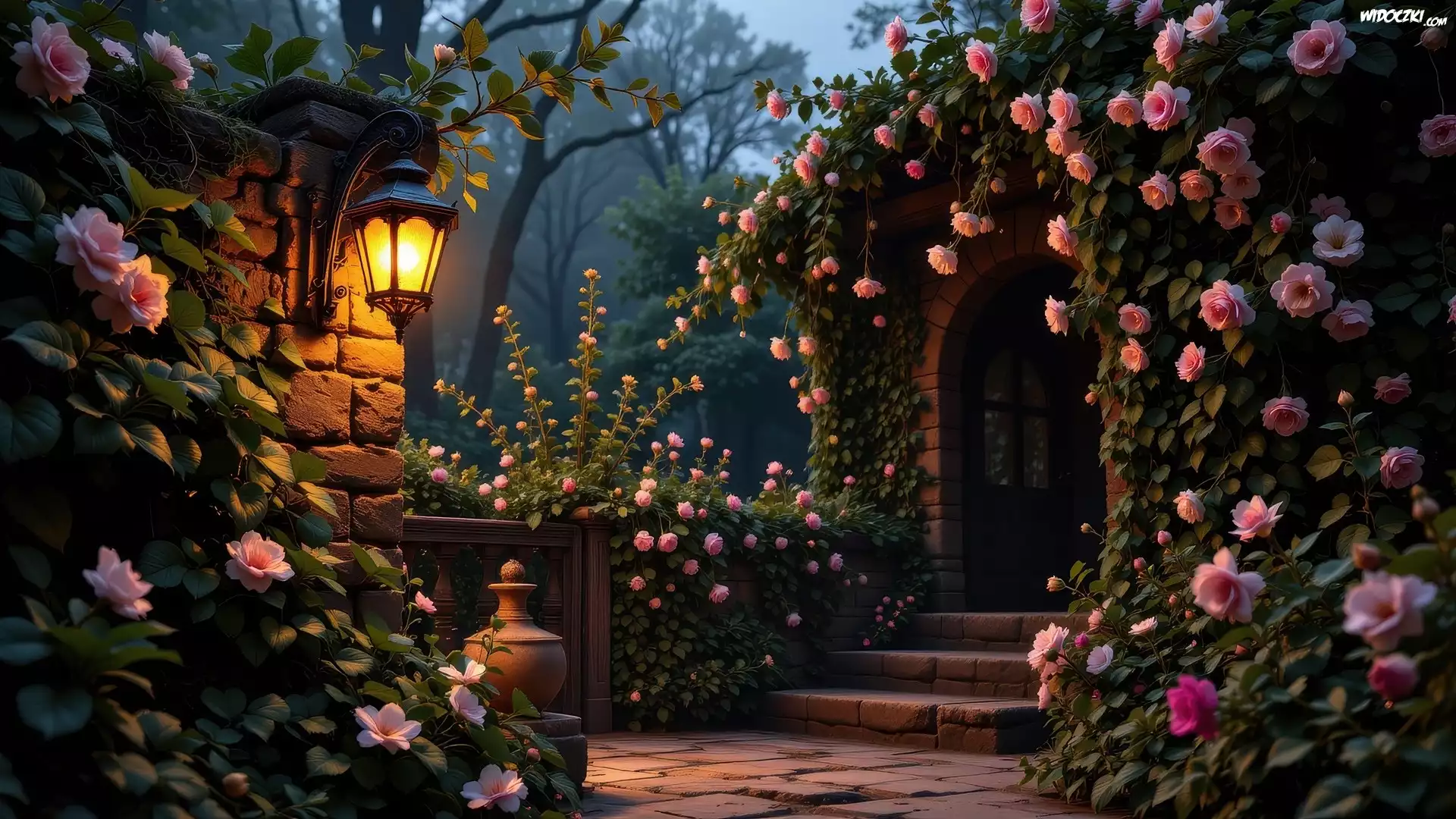 Ogród, Świecący, Lampa, Mur, Różowe, Kwiaty, Schody, Drzwi