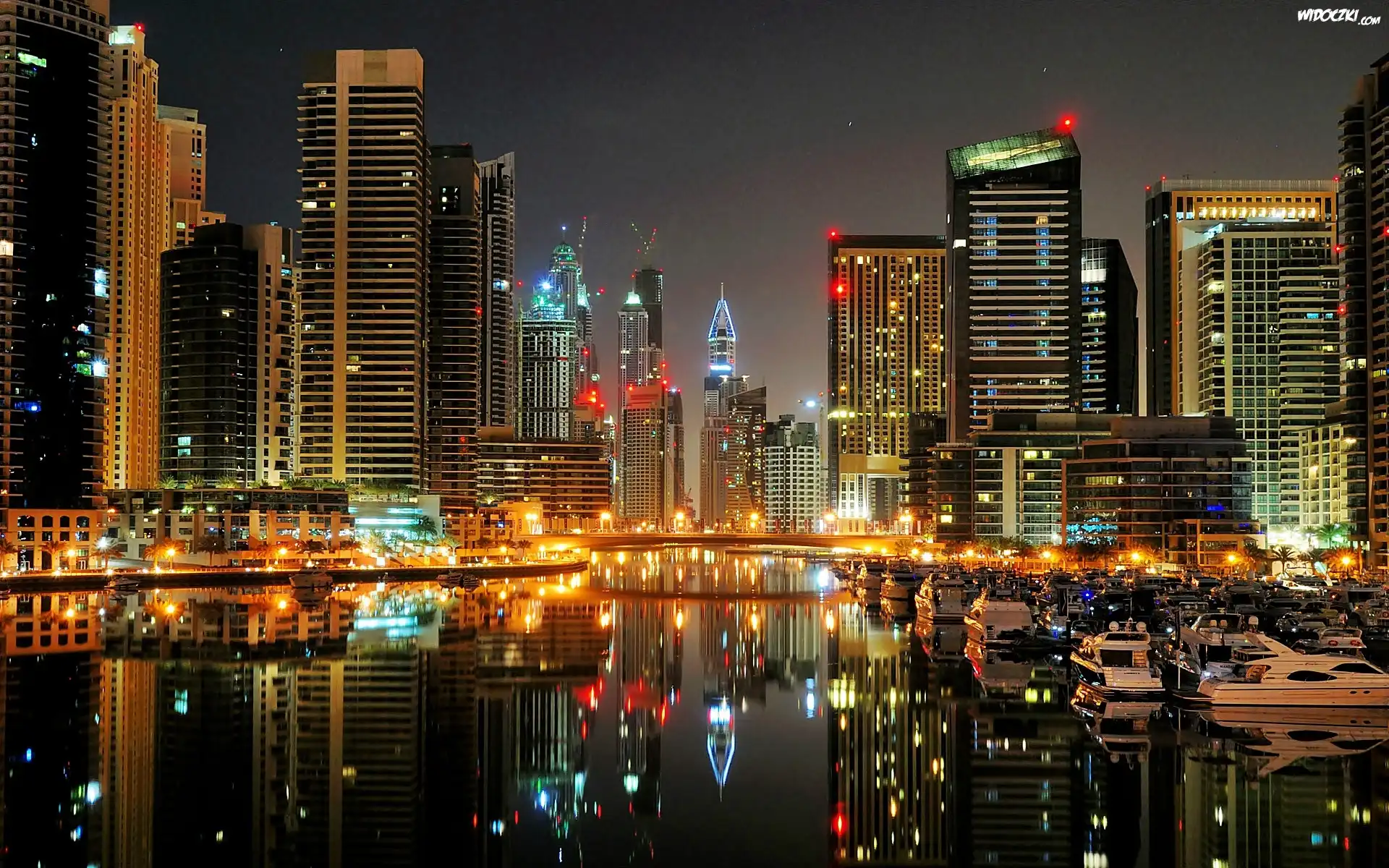 Dubaj, NocÄ…, Drapacze, Chmur, Morze, Jachty