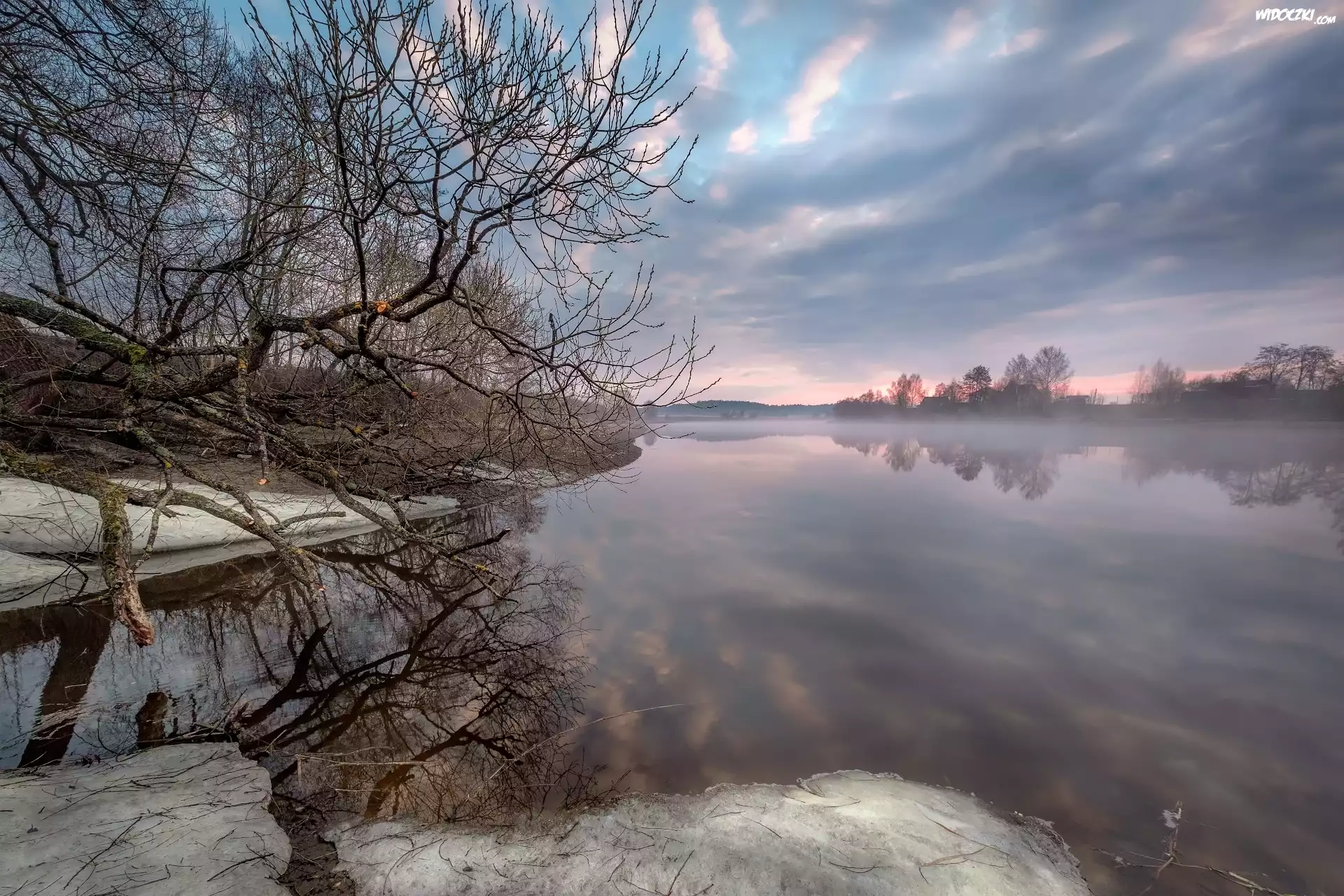 Zdjęcia, Rzeka Dubna, Domy, Mgła, Drzewo, Łatgalia, Łotwa