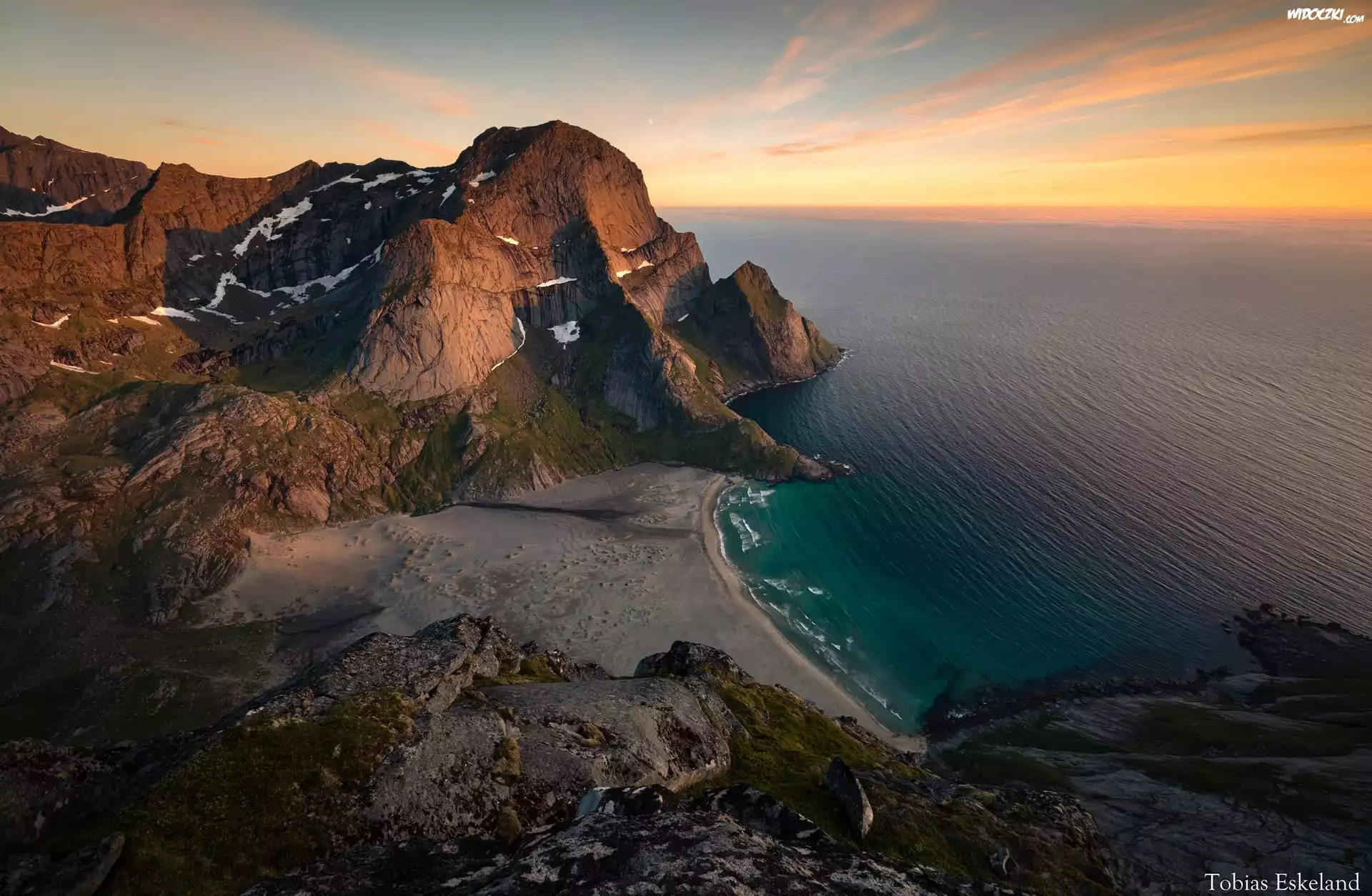 Norwegia, Góry, Szczyt, Helvetestinden, Bunesstranda, Lofoty, Morze Norweskie, Plaża, Dunes, Zachód słońca |