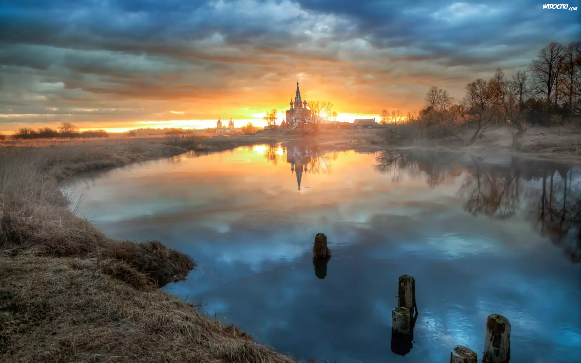 Rosja, Dunilovo, Świt, Mgła, Cerkiew, Rzeka, Drzewa, Odbicie