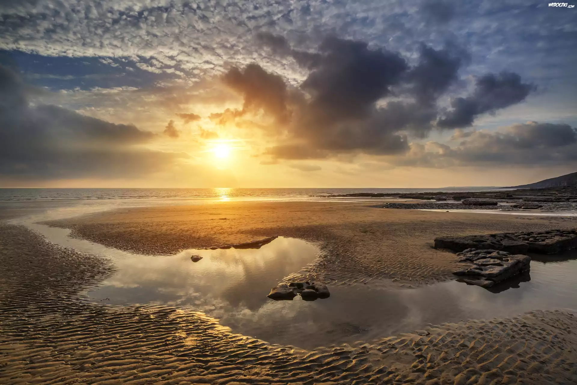 Zdjęcia, Plaża Dunraven Bay, Walia, Morze, Zachód słońca