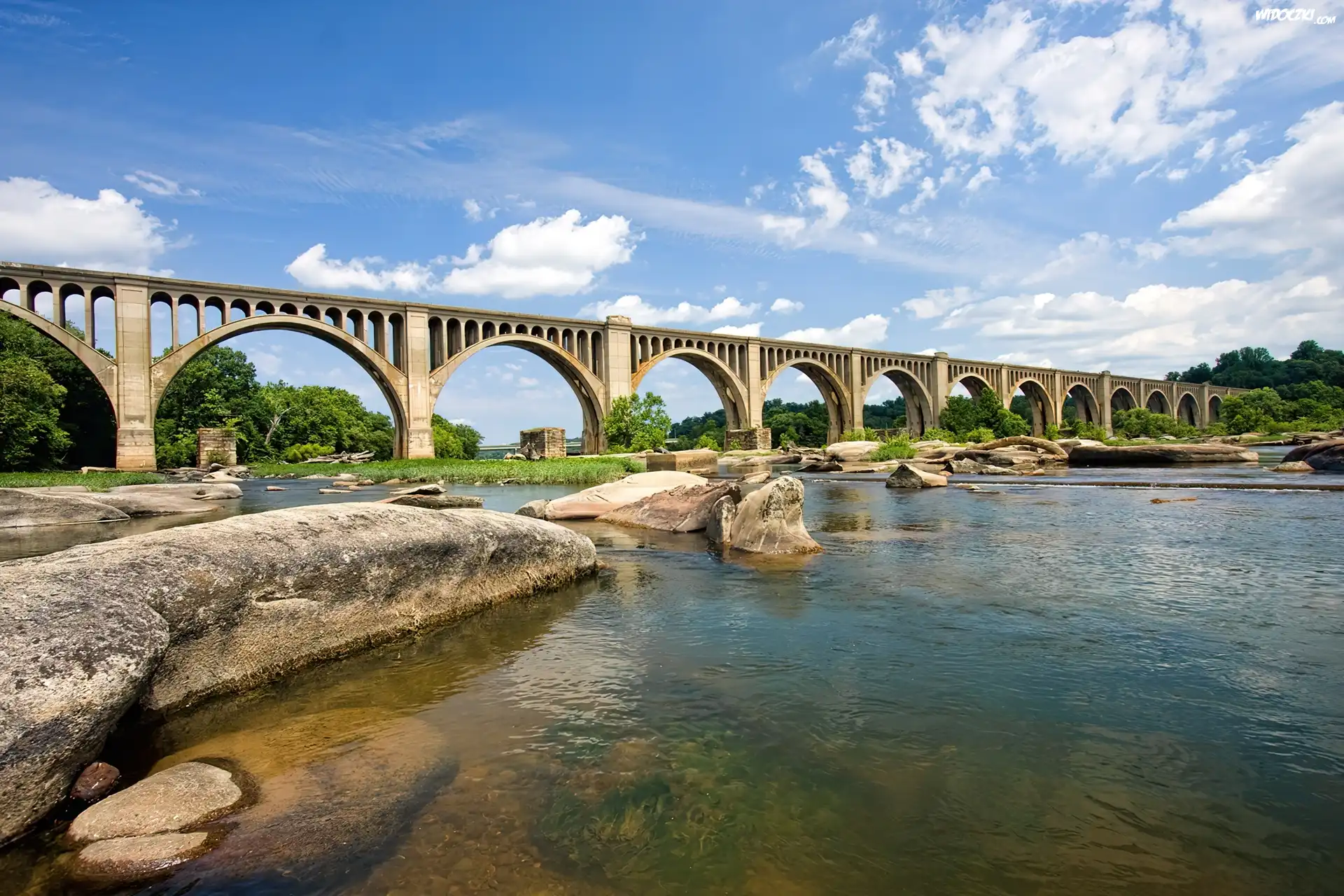 Zdjęcia, Duża, Rzeka, Most, Kamienie, Niebo, Chmury
