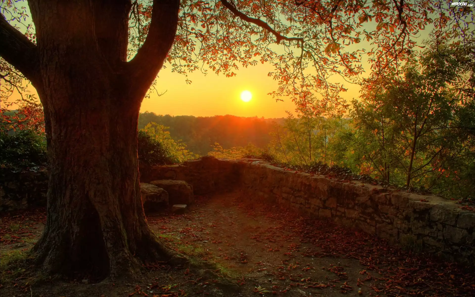 Zdjęcia, Duże, Drzewo, Murek, Zachód, Słońca