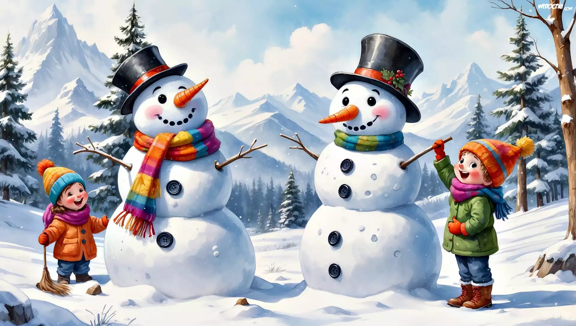 Zdjęcia, Zima, Dwa, Bałwany, Dzieci, Grafika