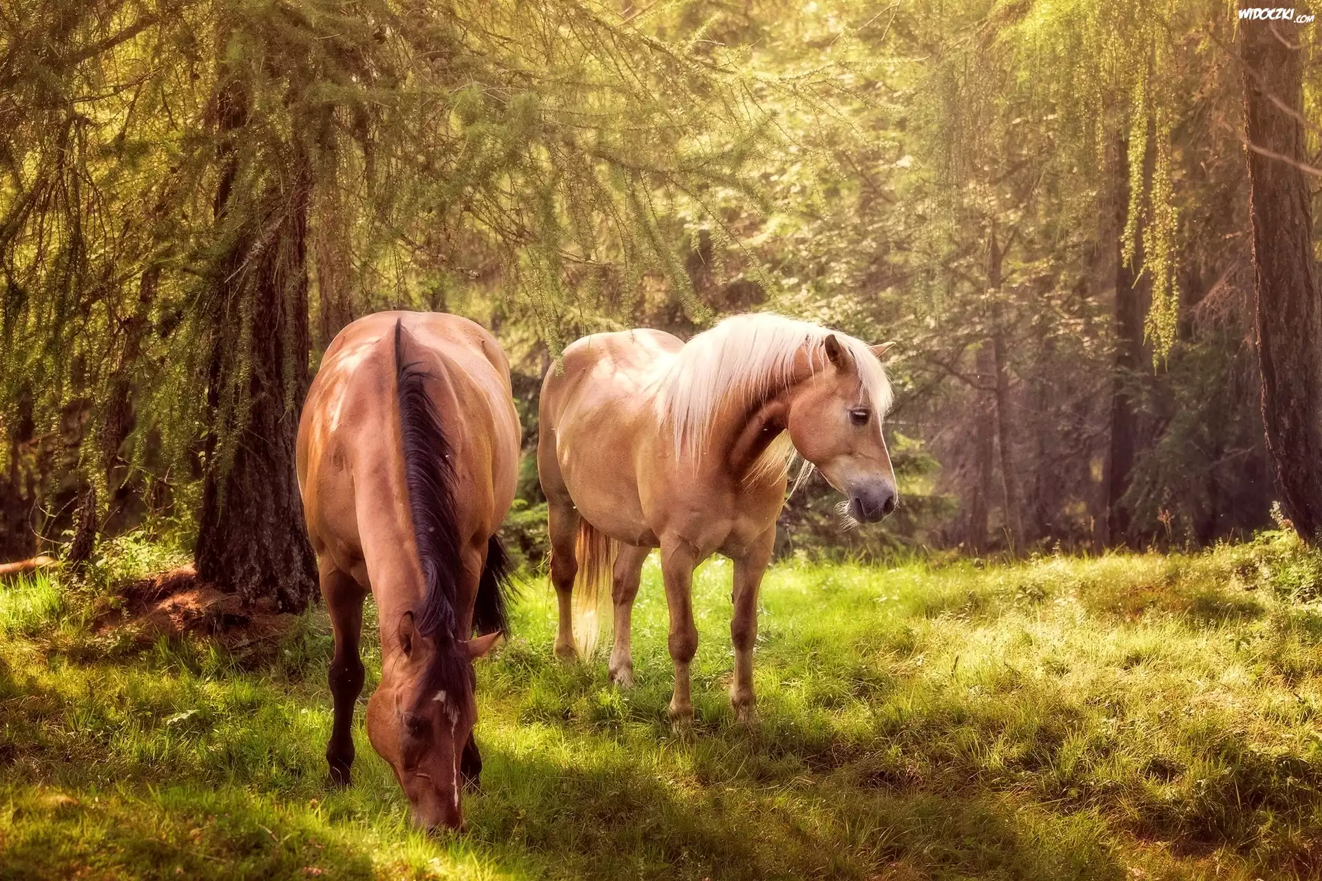 Zdjęcia, Dwa, Konie, Las, Trawa
