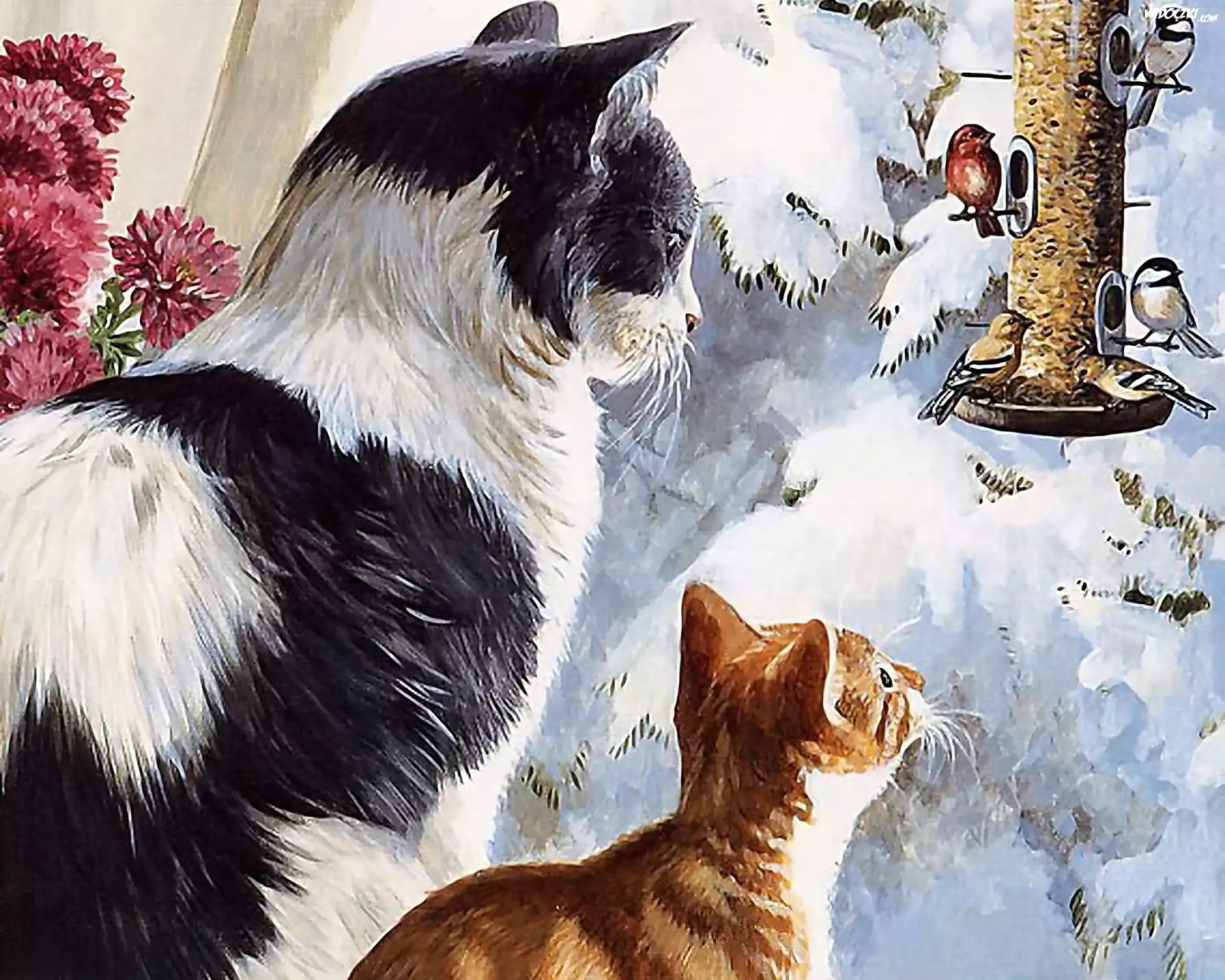 Zdjęcia, Dwa, Kotki, Karmnik, Ptaki, Zima