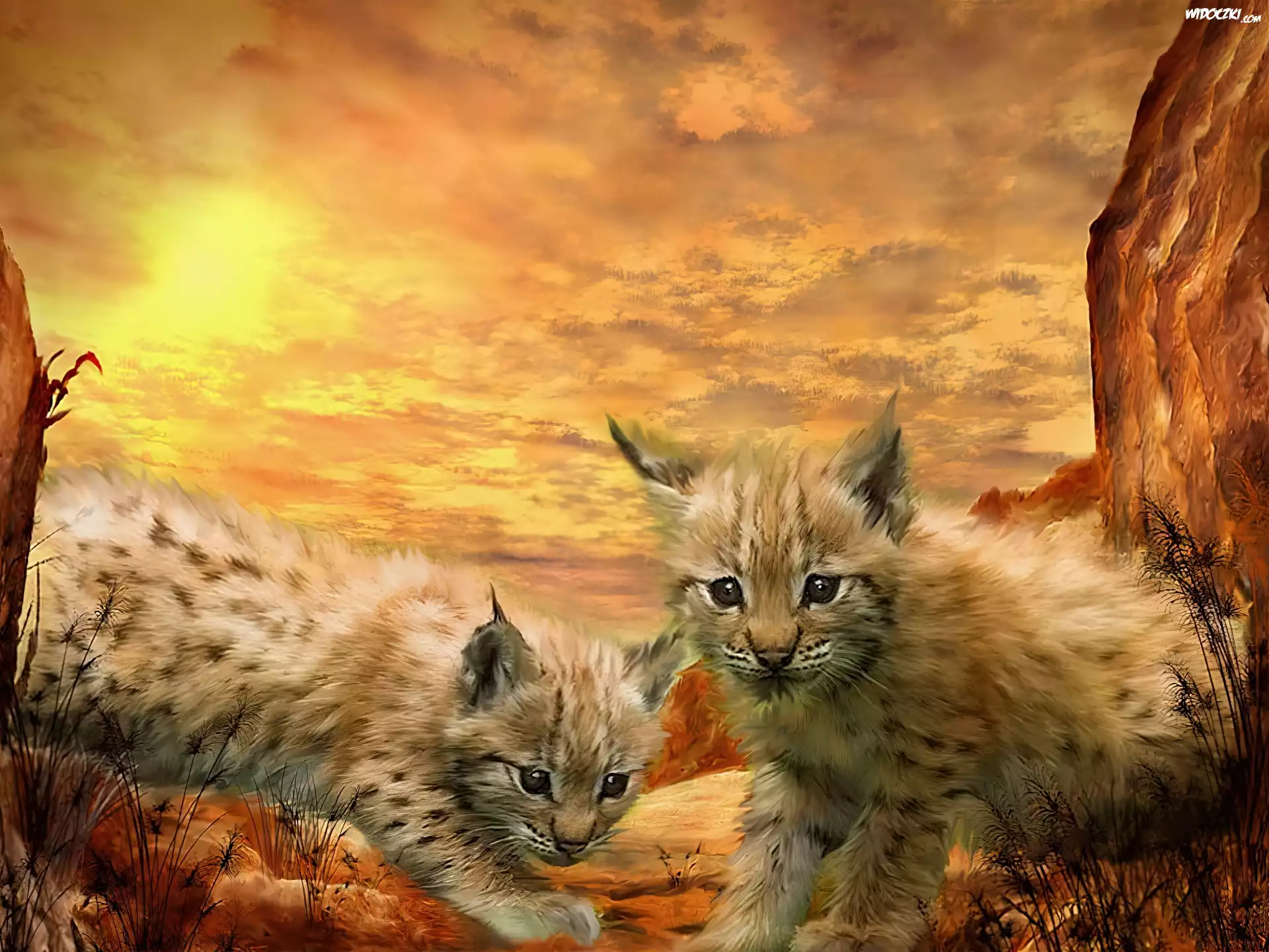 Dwa, Małe, Rysie, Zachód, Słońca, Art