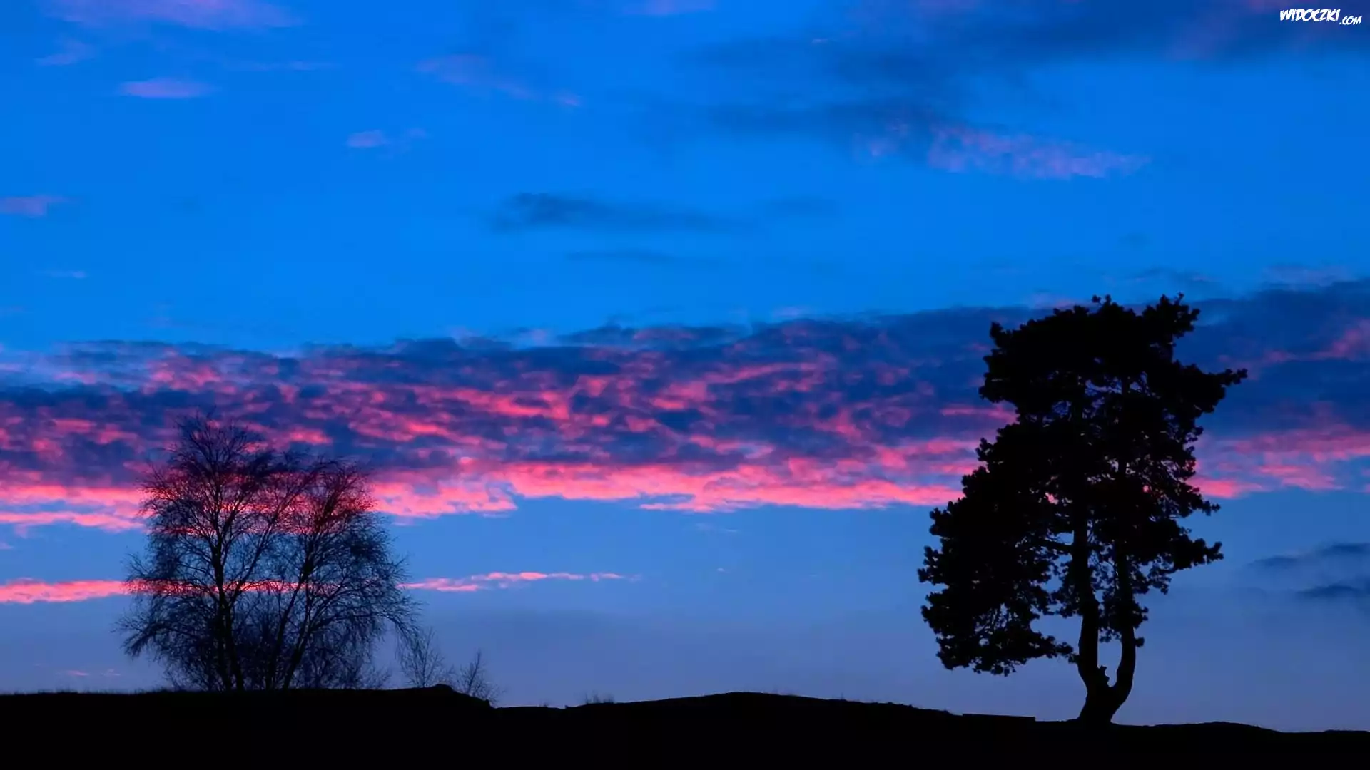 Zdjęcia, Dwa, Drzewa, Zachód, Słońca