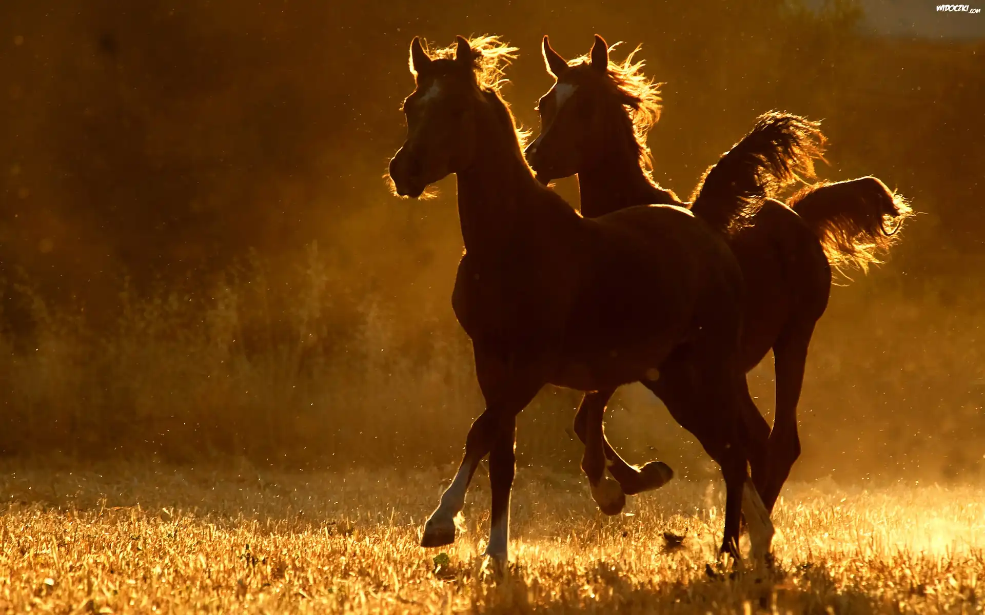 Zdjęcia, Dwa, Konie, Zachód, Słońca