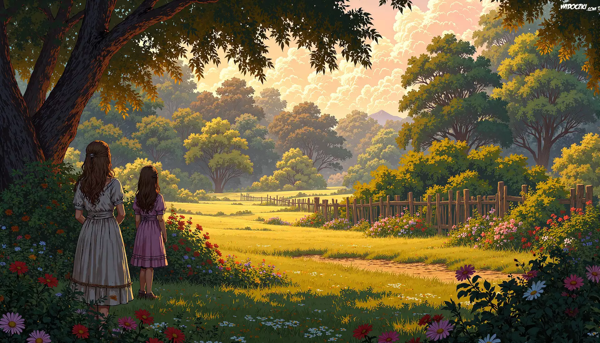 Łąka, Kwiaty, Drzewa, Dwie, Dziewczynki, Ogrodzenie, Grafika