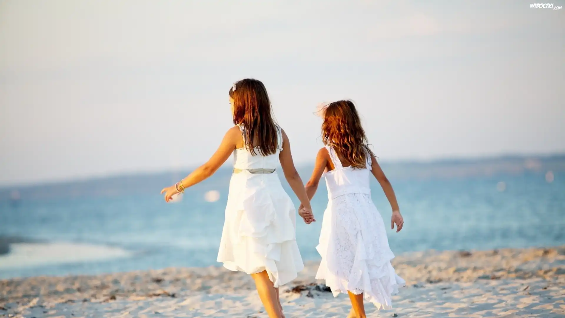 Zdjęcia, Dzieci, Dwie, Dziewczynki, Białe, Sukieneczki, Morze, Plaża, Spacer