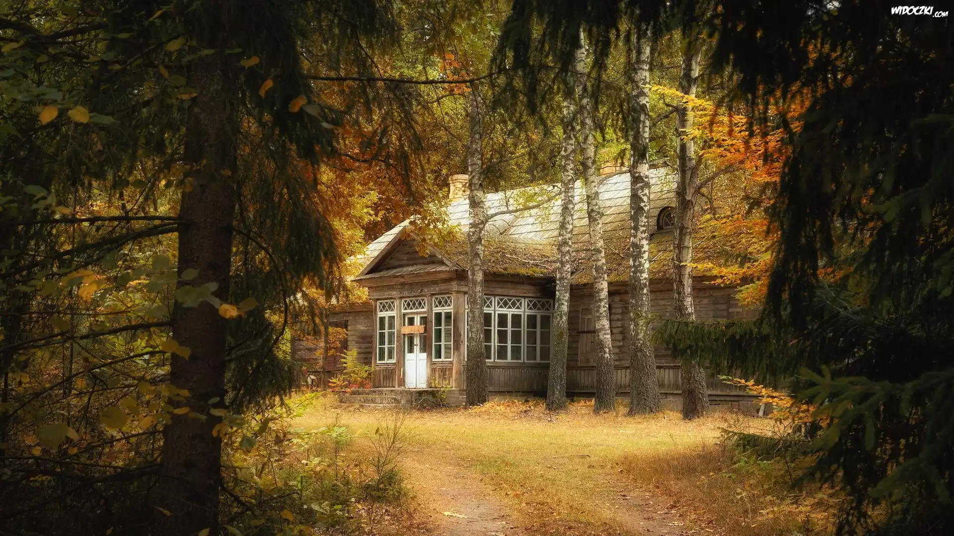 Las, Jesień, Droga, Drzewa, Dom, Dworek, Jodłówka, Dubicze Cerkiewne, Województwo podlaskie, Polska |