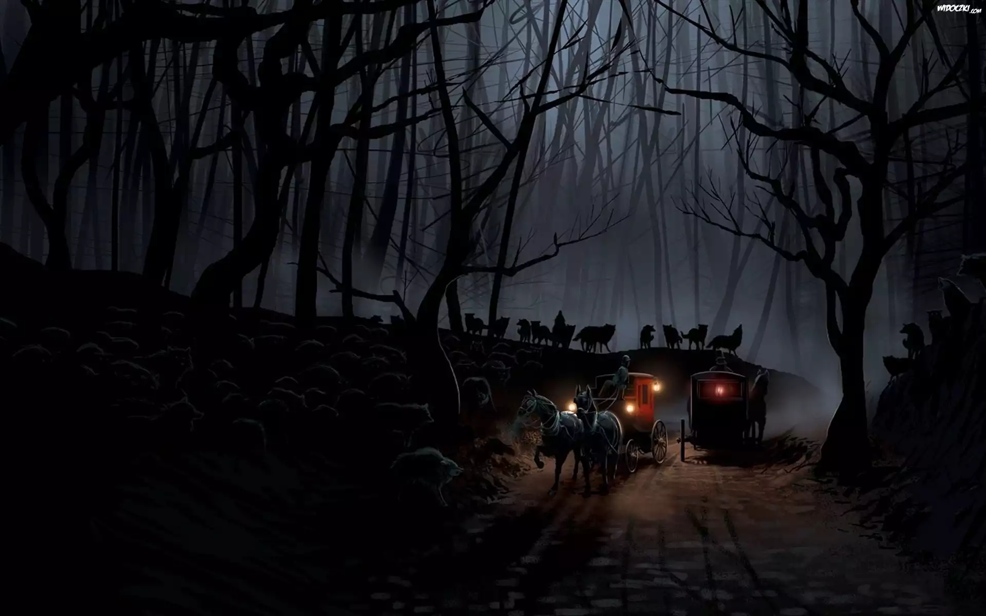 Dyliżanse, Droga, Las, Wilki, Mgła, Noc