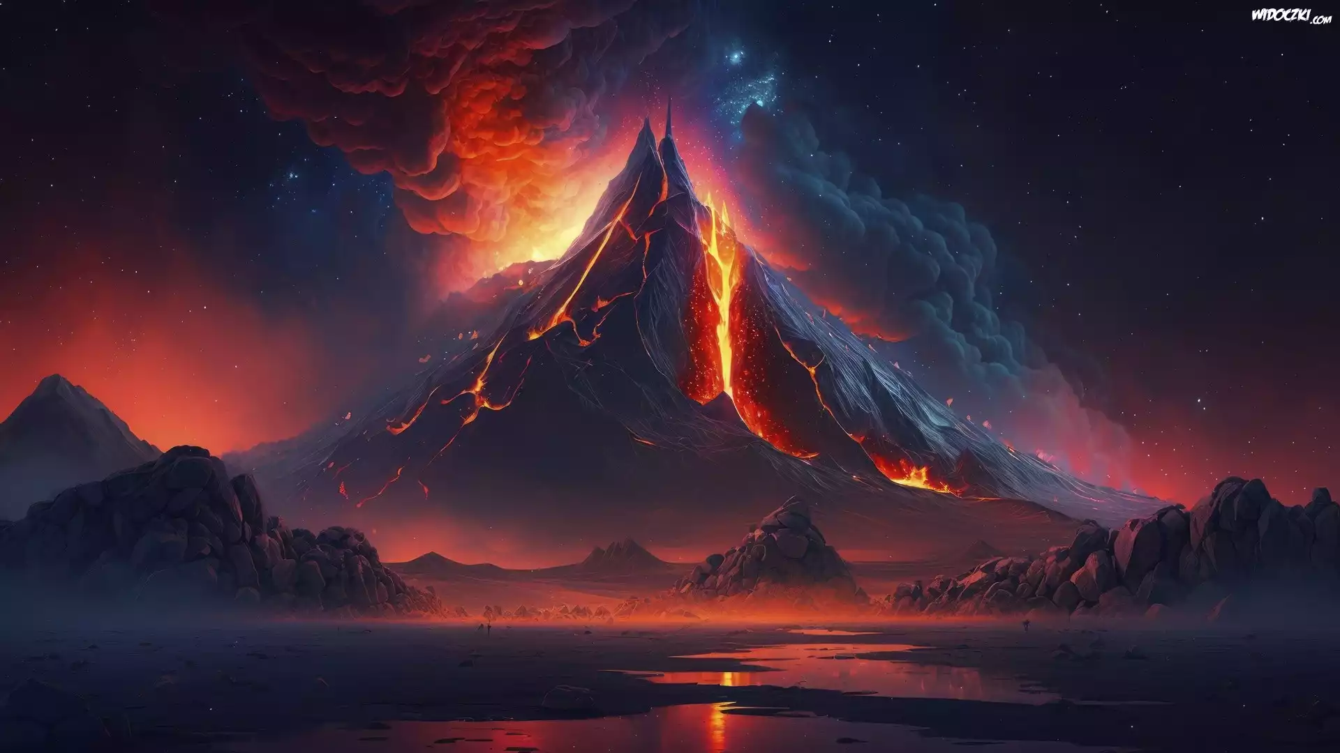 Wulkan, Erupcja, Ogień, Dym, Noc, AI