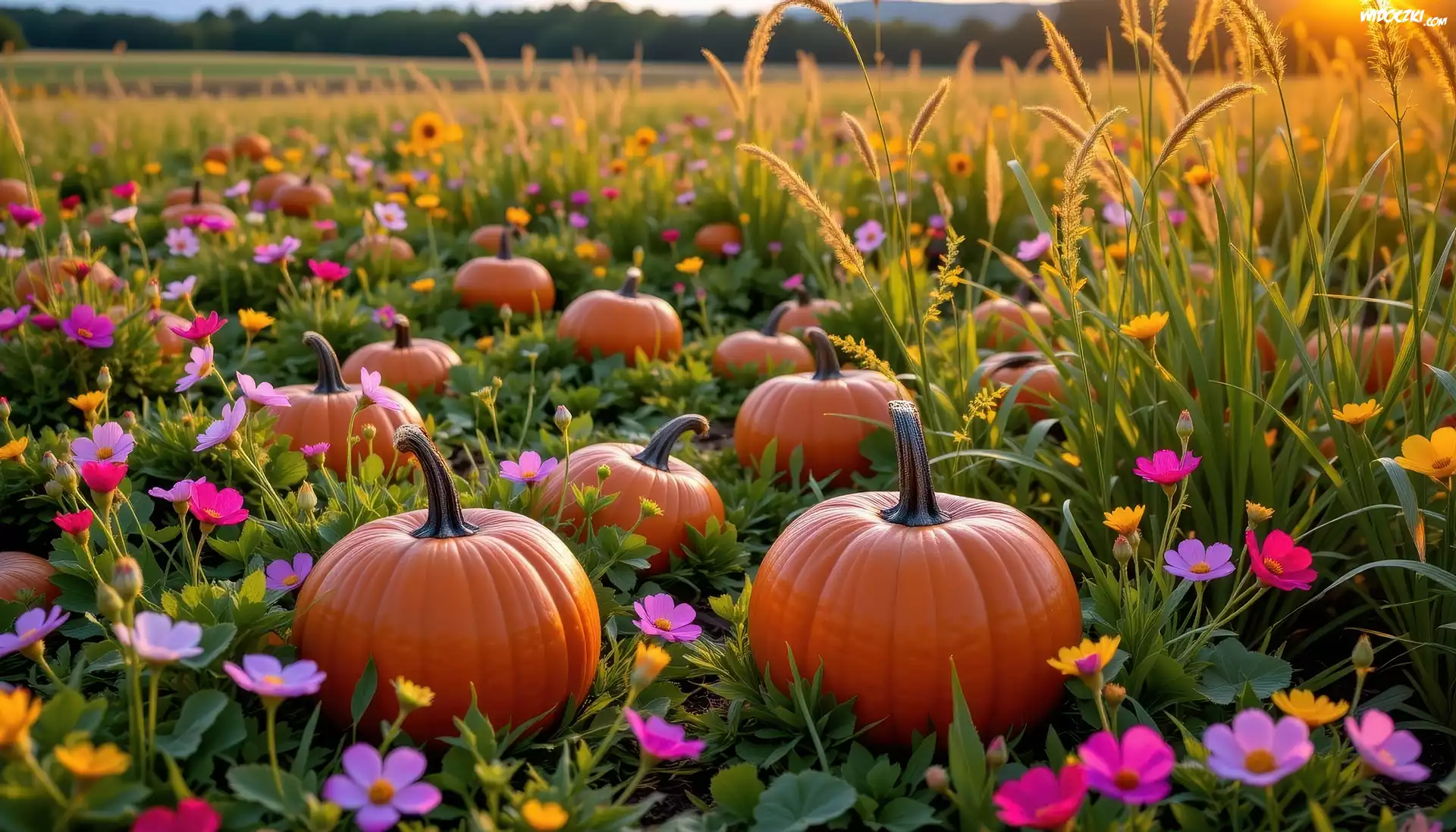 Kwiaty, Łąka, Trawy, Dynie, Grafika AI