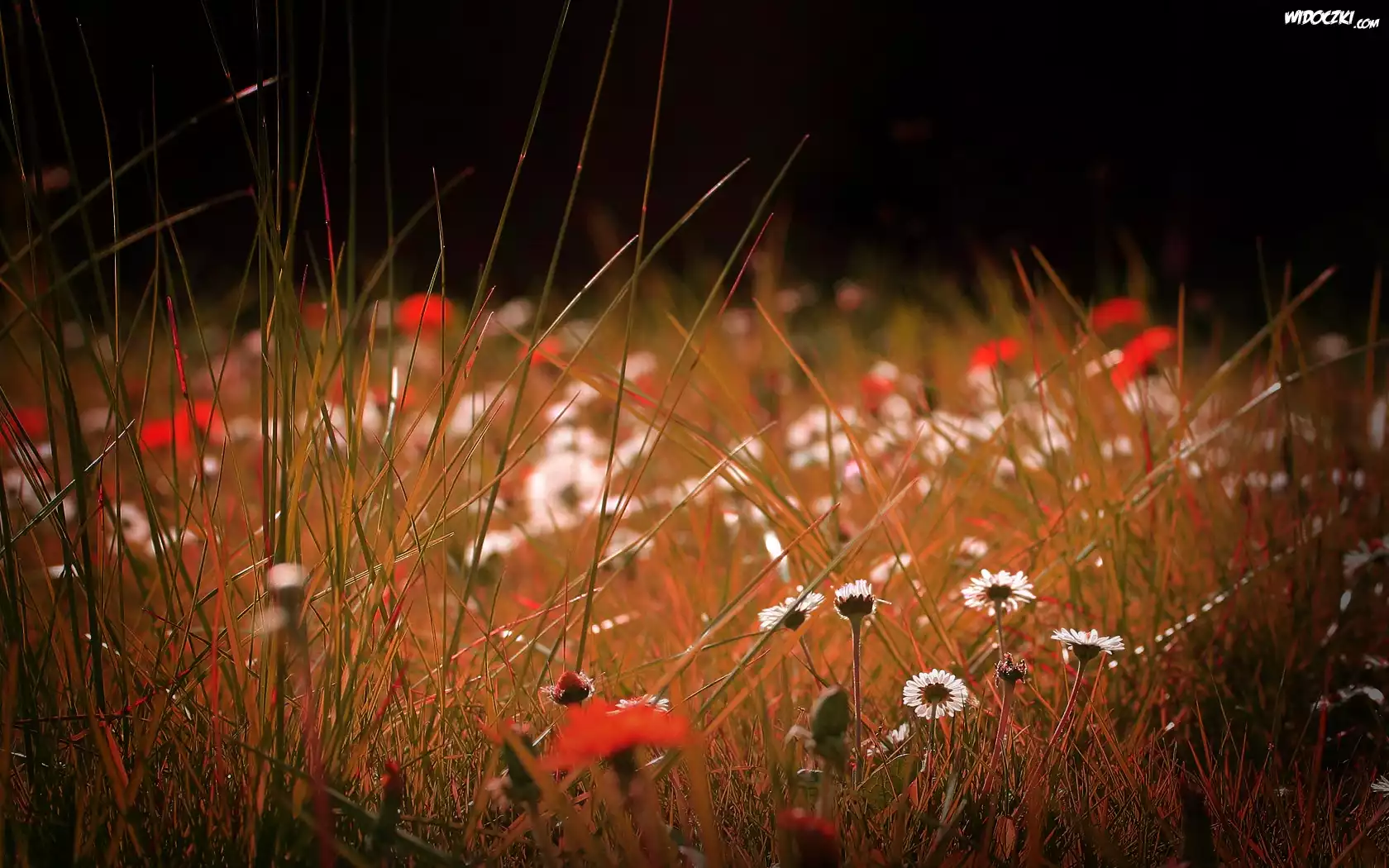 Łąka, Kwiaty, Stokrotki, Źdźbła, Trawy