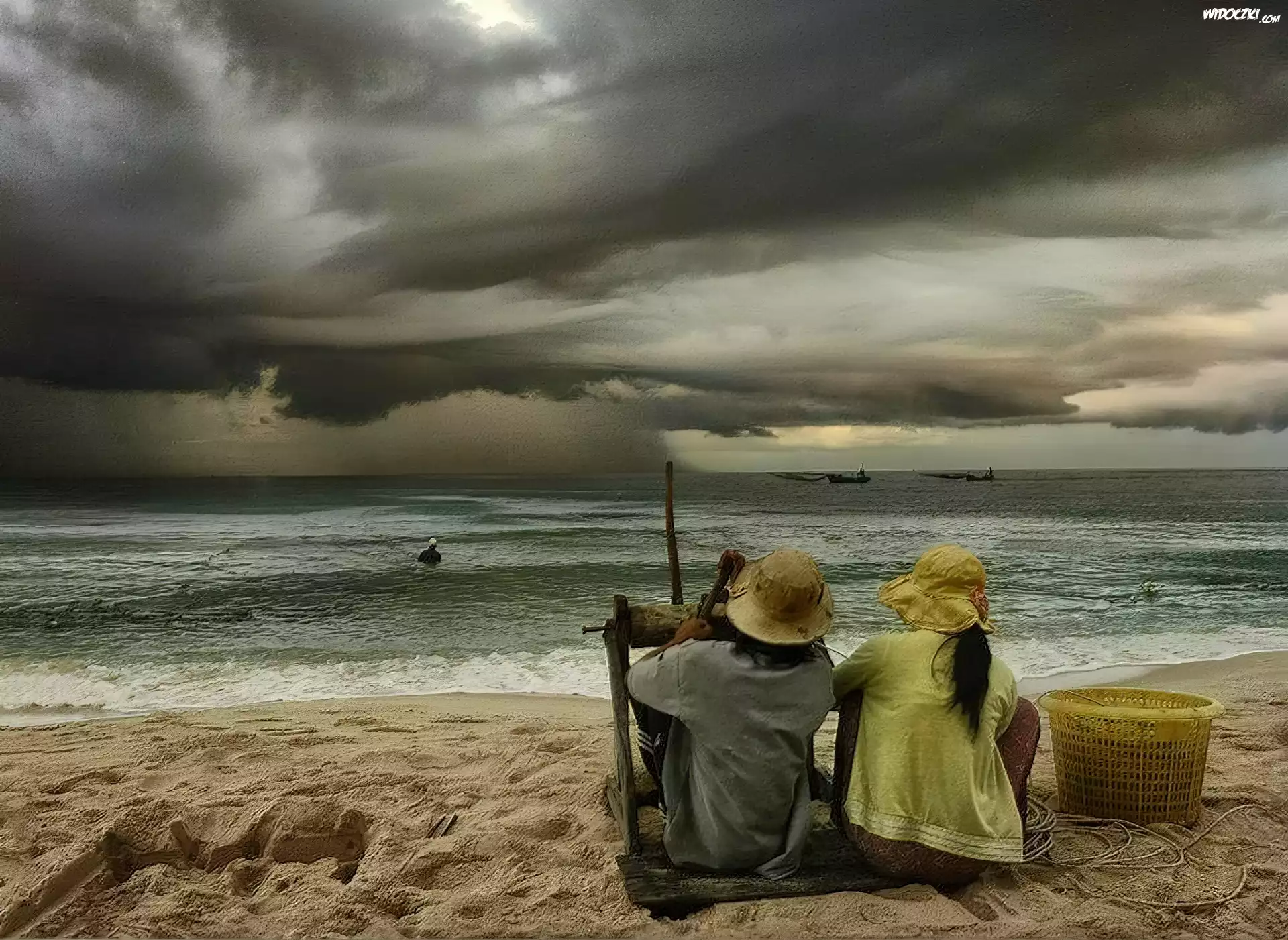 Zdjęcia, Dzieci, Morze, Chmury, Plaża