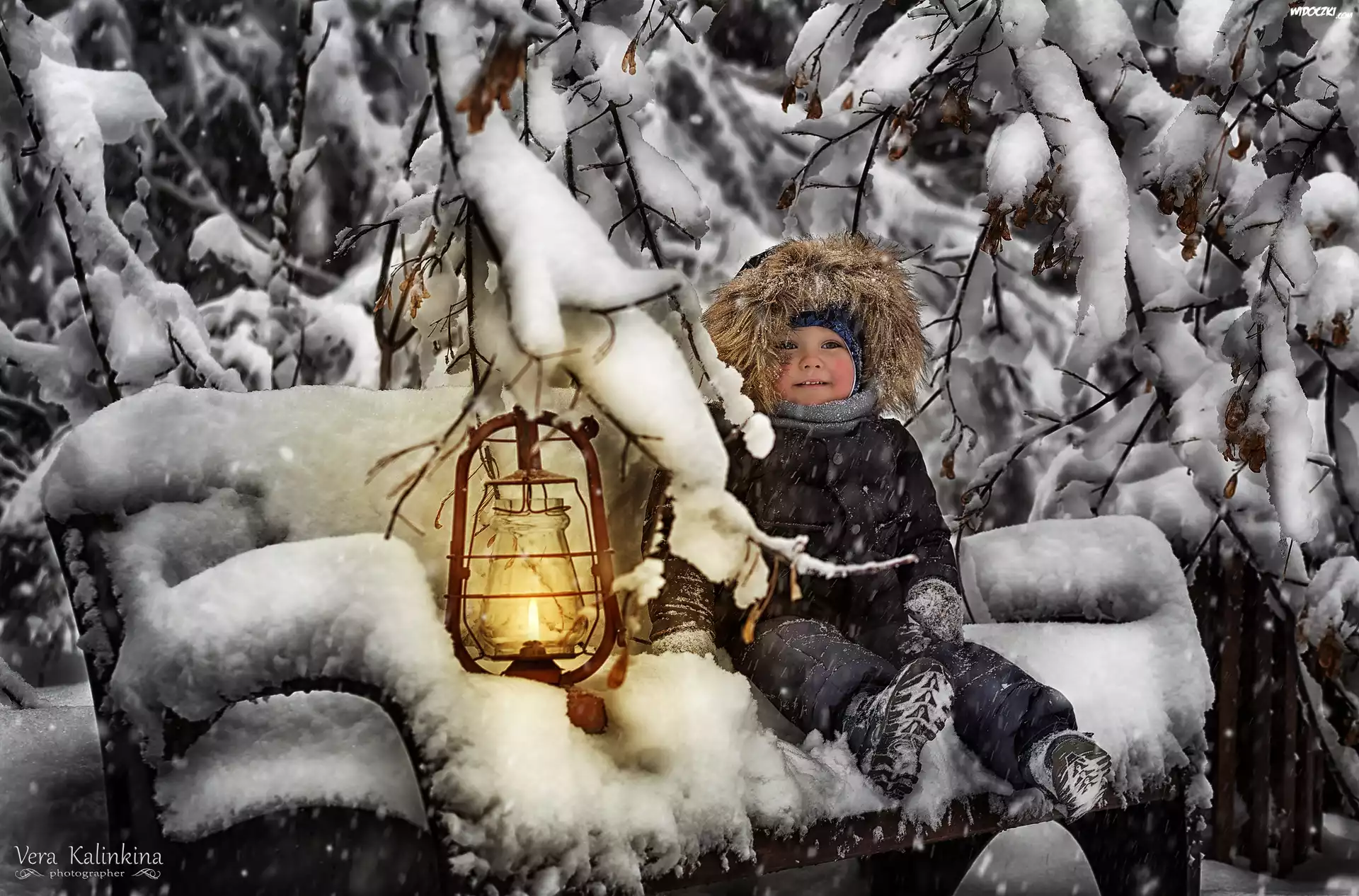 Zdjęcia, Dziecko, Ławka, Lampa, Gałęzie, Zima