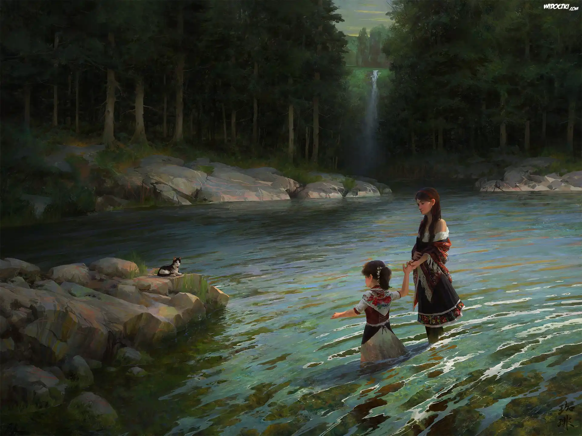 Zdj臋cia, Kobieta, Dziecko, Rzeka, Las, Kamienie, Kotek, Grafika