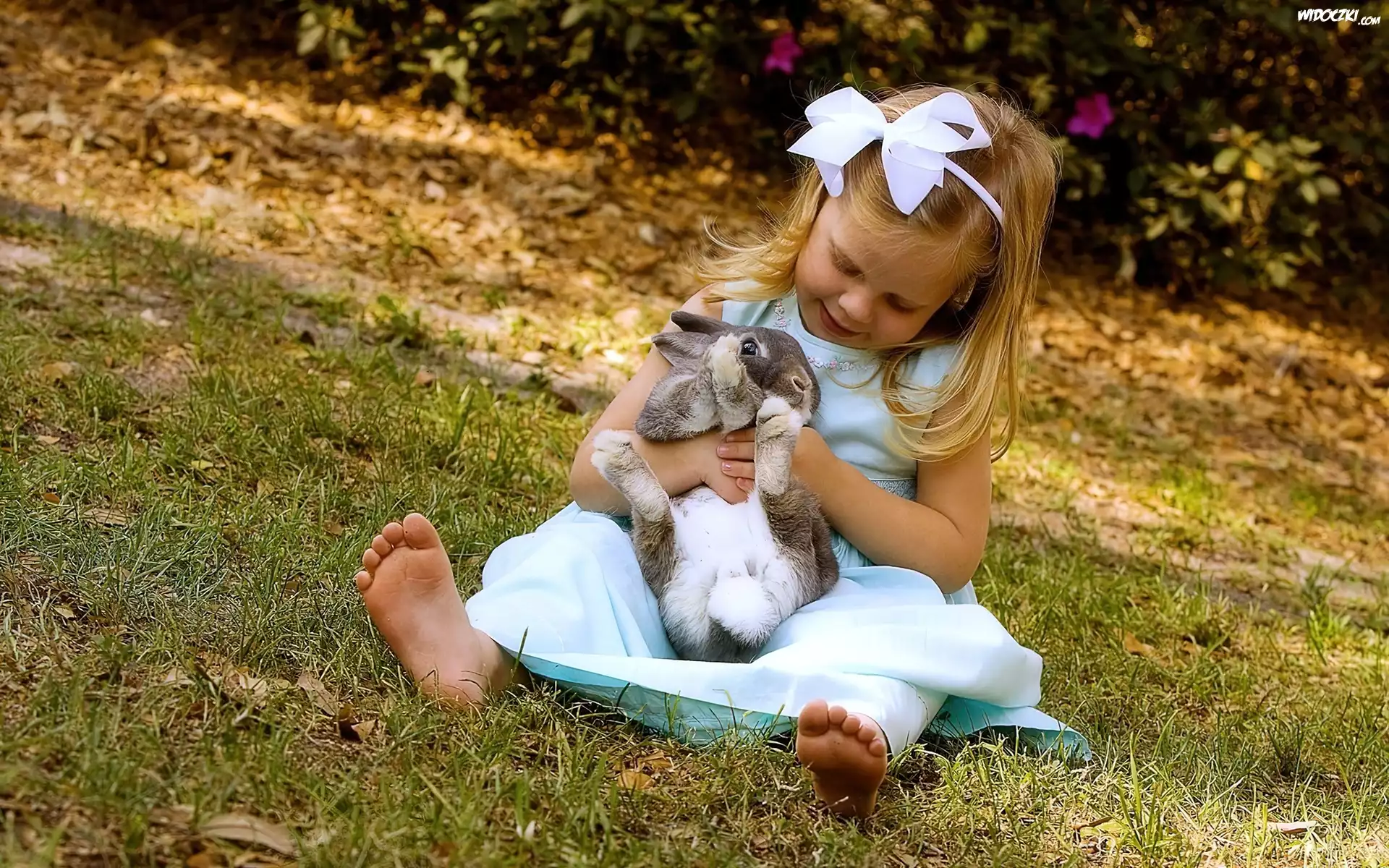 Zdjęcia, Dziecko, Dziewczynka, Królik, Łąka
