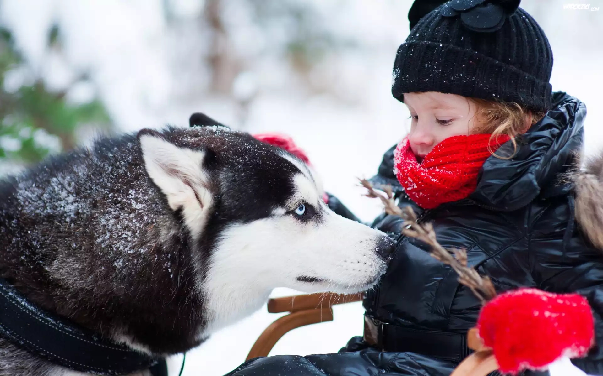 Zdjęcia, Dziecko, Zima, Gałązka, Pies, Siberian Husky