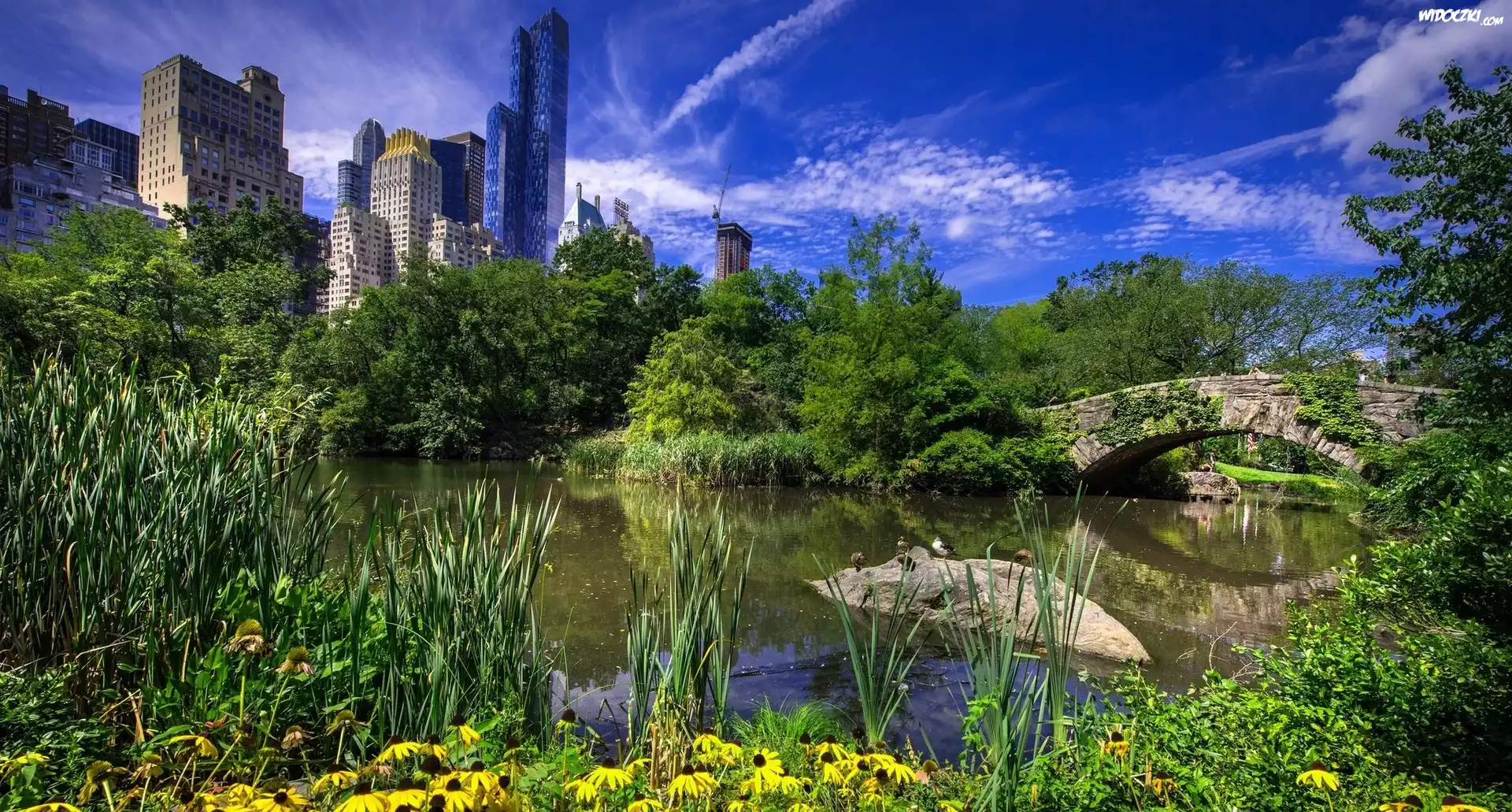 Stany Zjednoczone, Nowy Jork, Dzielnica Manhattan, Central Park, Staw, Most Gapstow, Drapacze chmur, Drzewa |