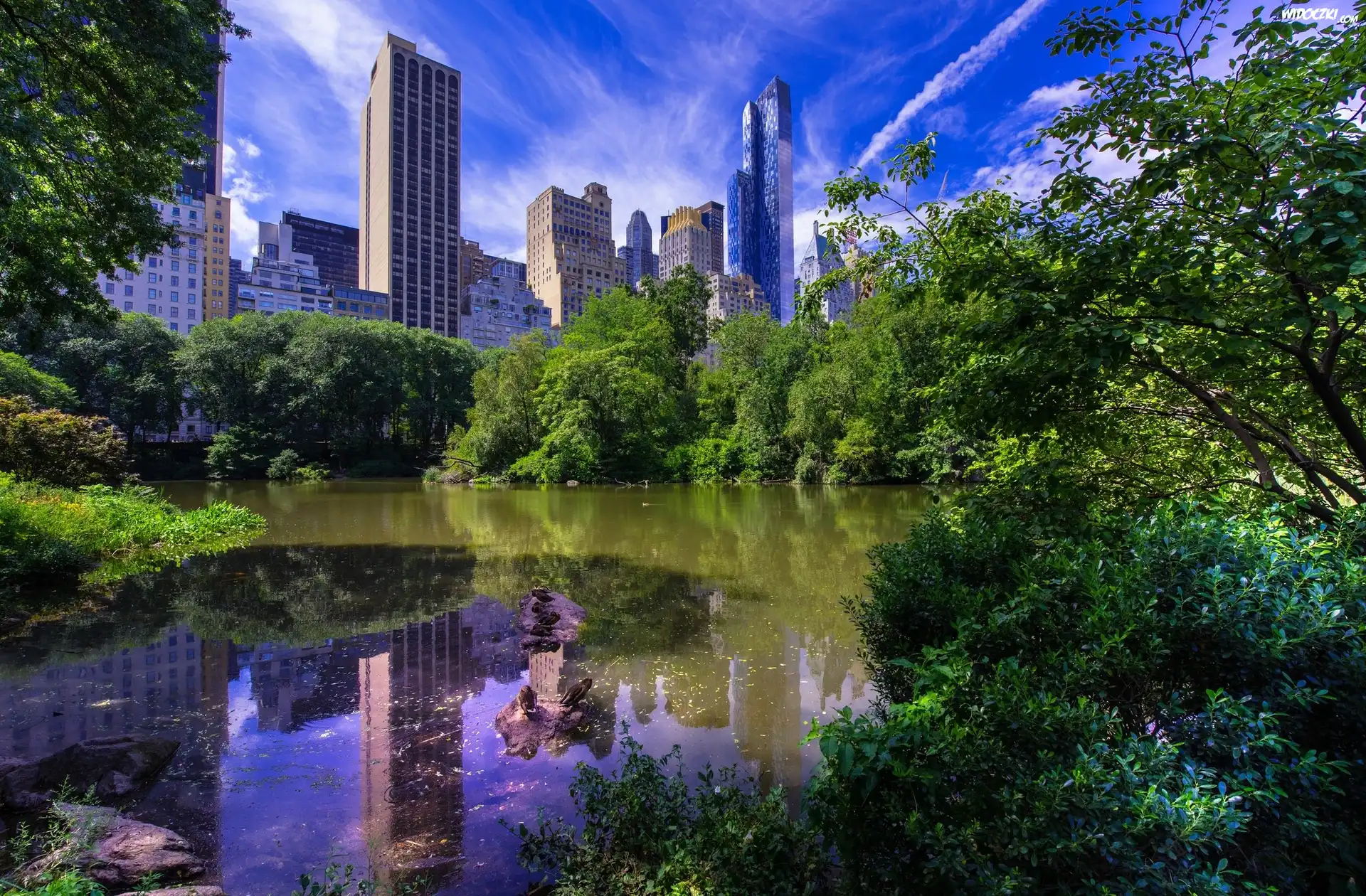 Stany Zjednoczone, Nowy Jork, Dzielnica Manhattan, Park miejski Central Park, Staw, Drapacze chmur, Drzewa |