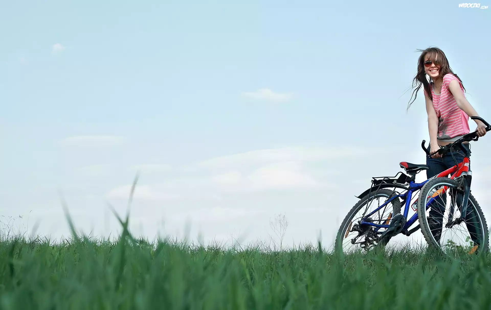Dziewczyna, Brunetka, Łąka, Rower