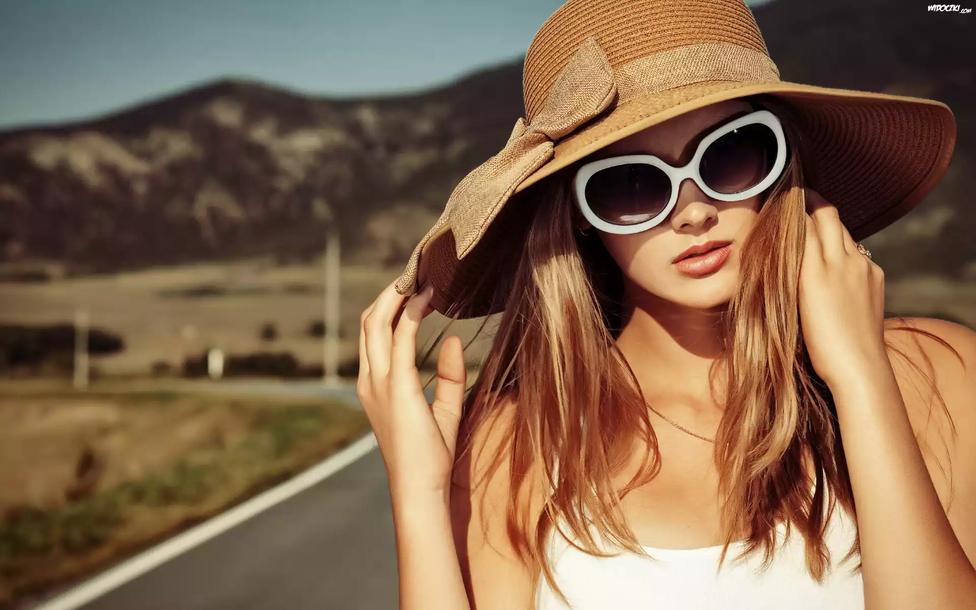 Zdjęcia, Dziewczyna, Okulary, Kapelusz, Droga, Góry