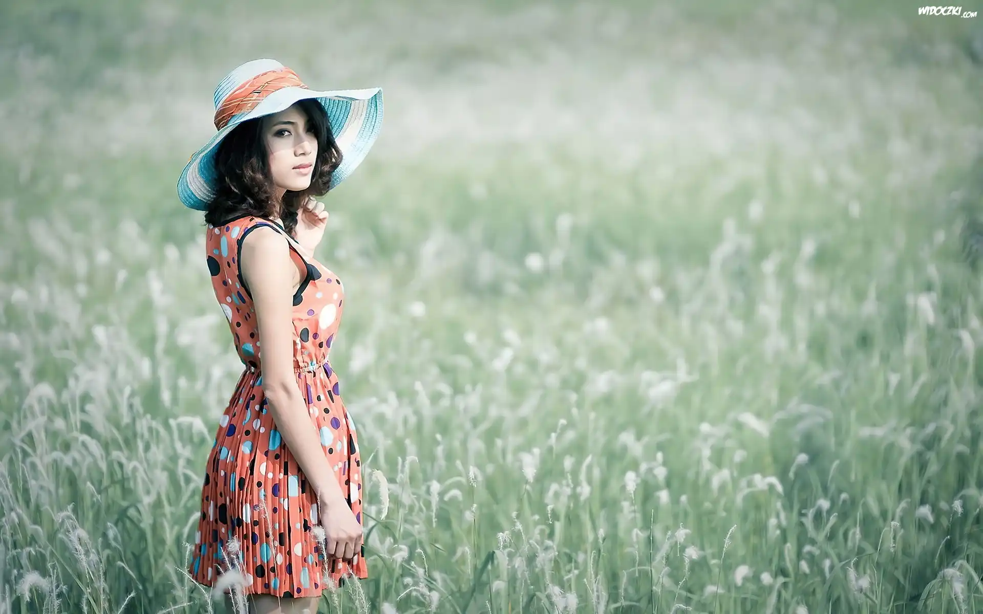 Dziewczyna, Brunetka, Kapelusz, Łąka