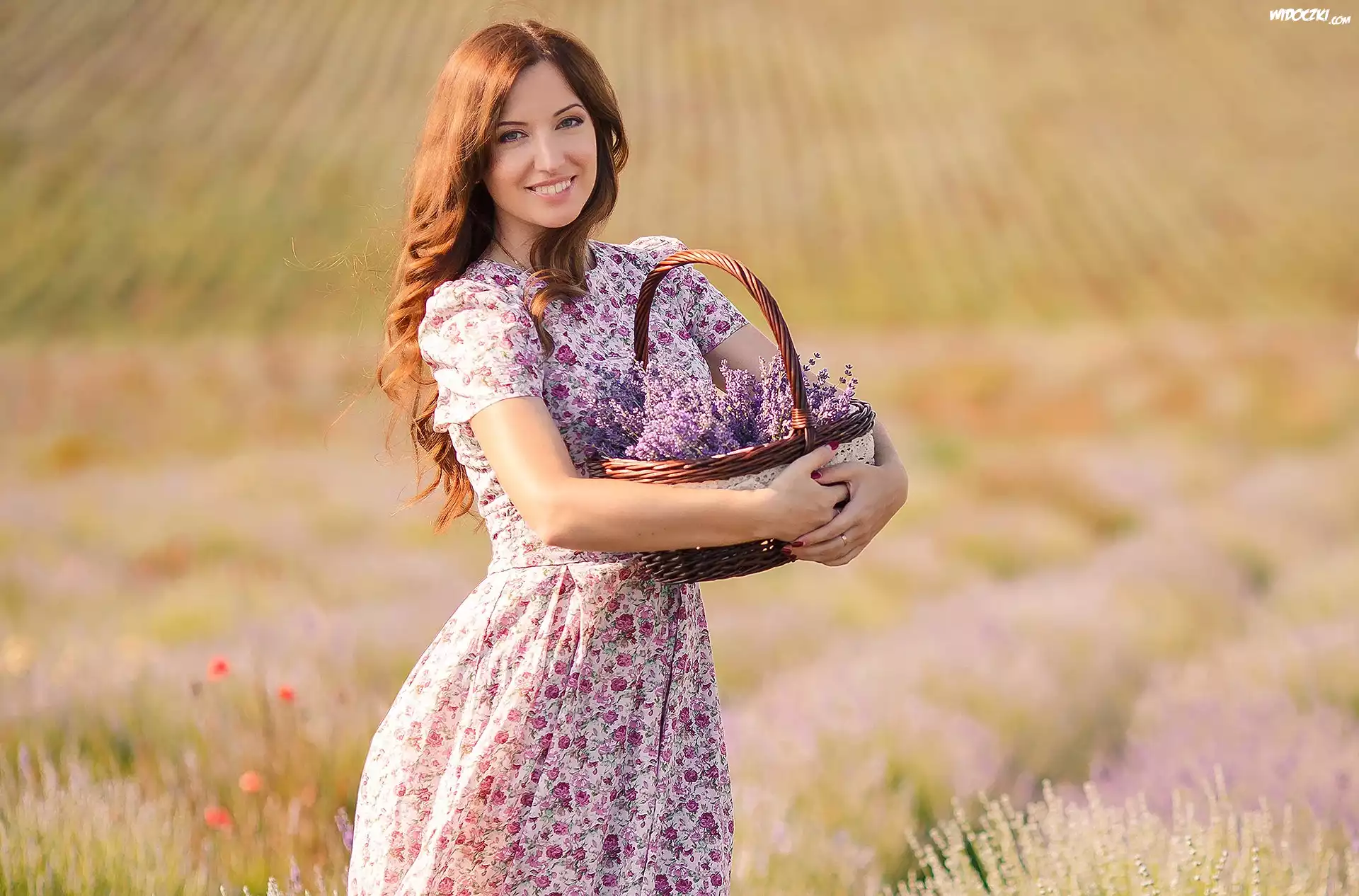 Zdjęcia, Dziewczyna, Brunetka, Łąka, Koszyk, Kosz, Lawenda
