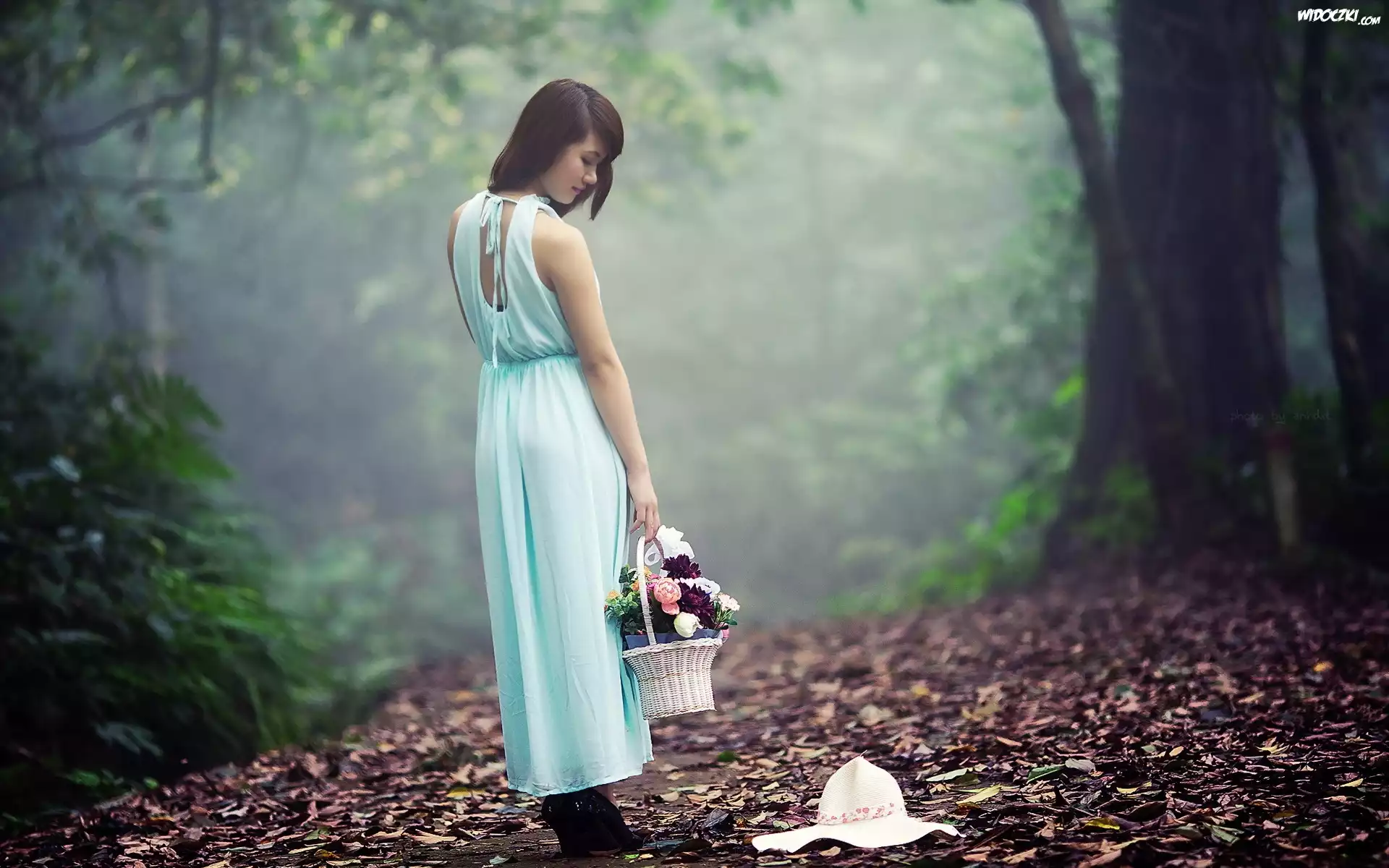 Dziewczyna, Las, Liście, Mgła, Koszyk, Kwiaty