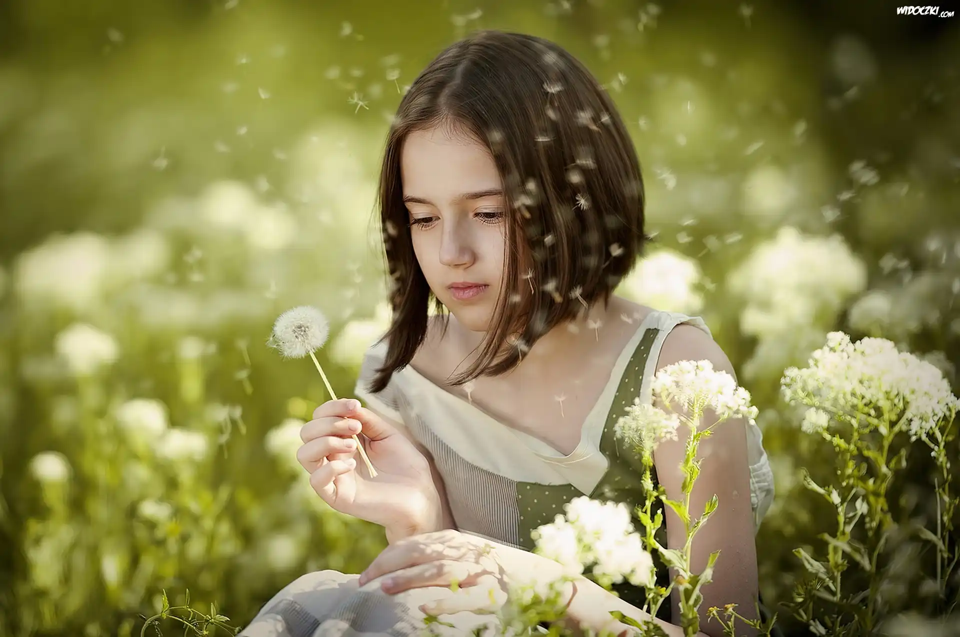 Zdjęcia, Dziewczyna, Łąka, Kwiaty, Dmuchawce
