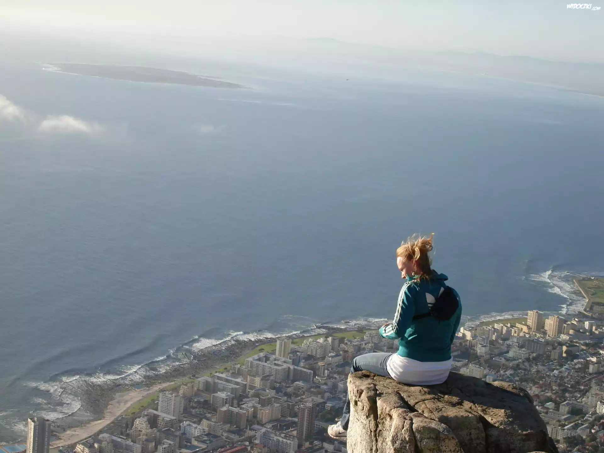 Zdjęcia, Dziewczyna, Skała, Morze, Miasto
