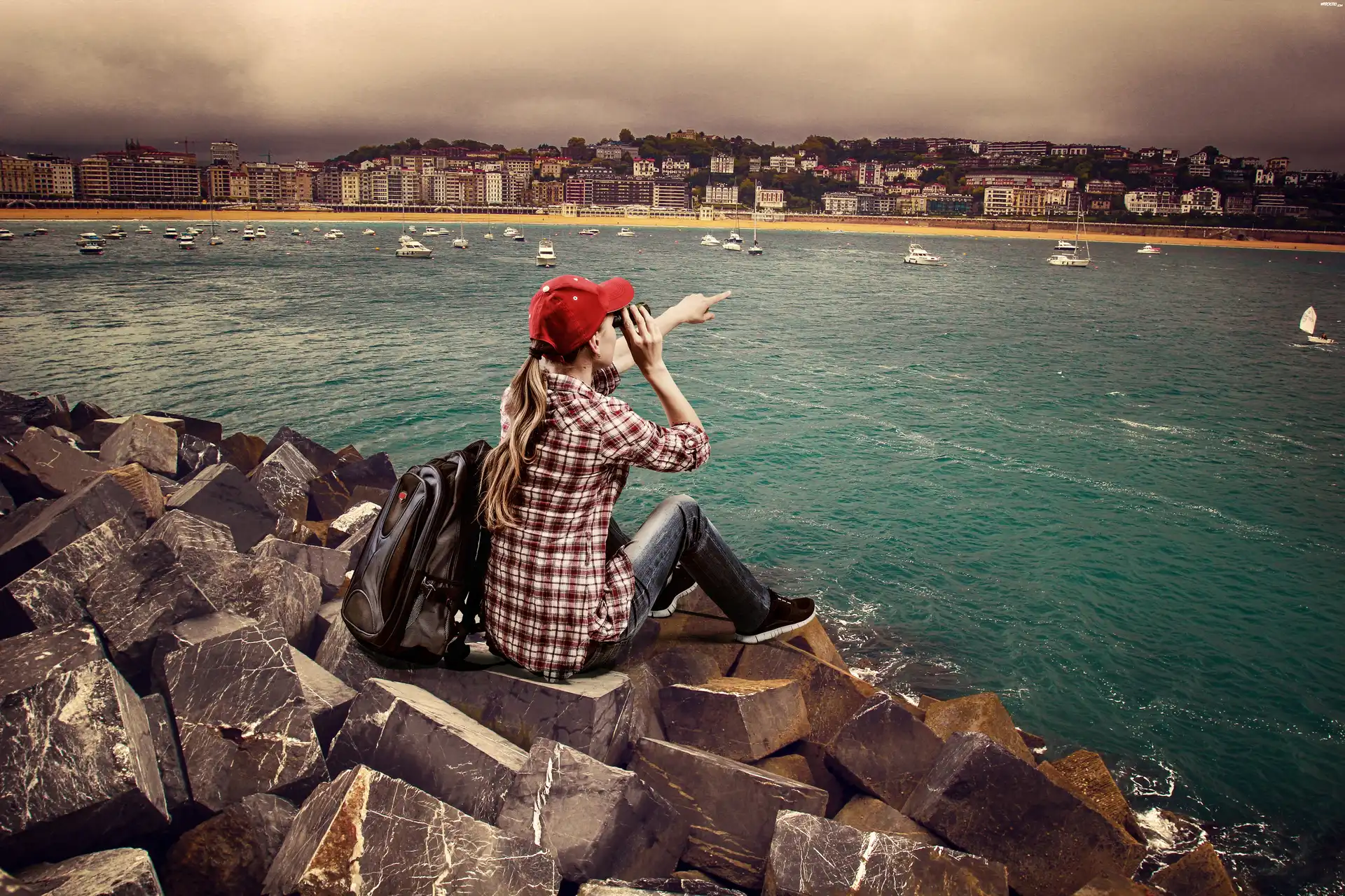Zdjęcia, Dziewczyna, Lornetka, Kamienie, Rzeka, Motorówki, Miasto